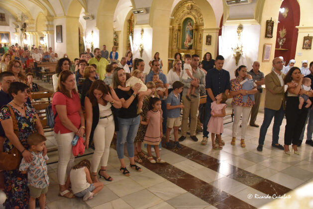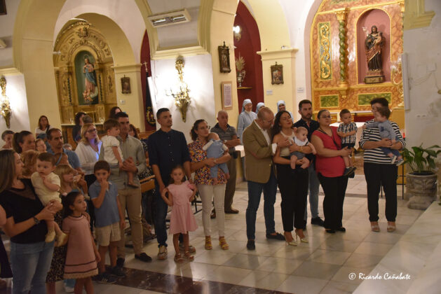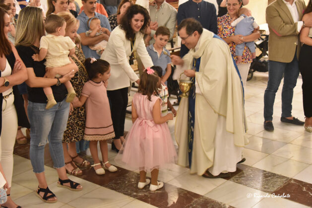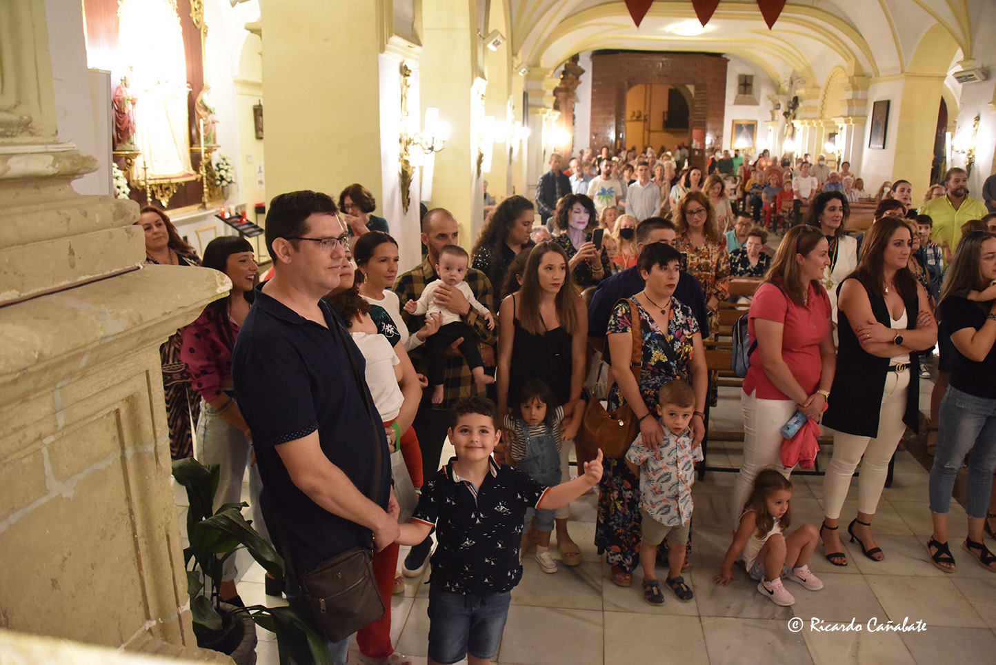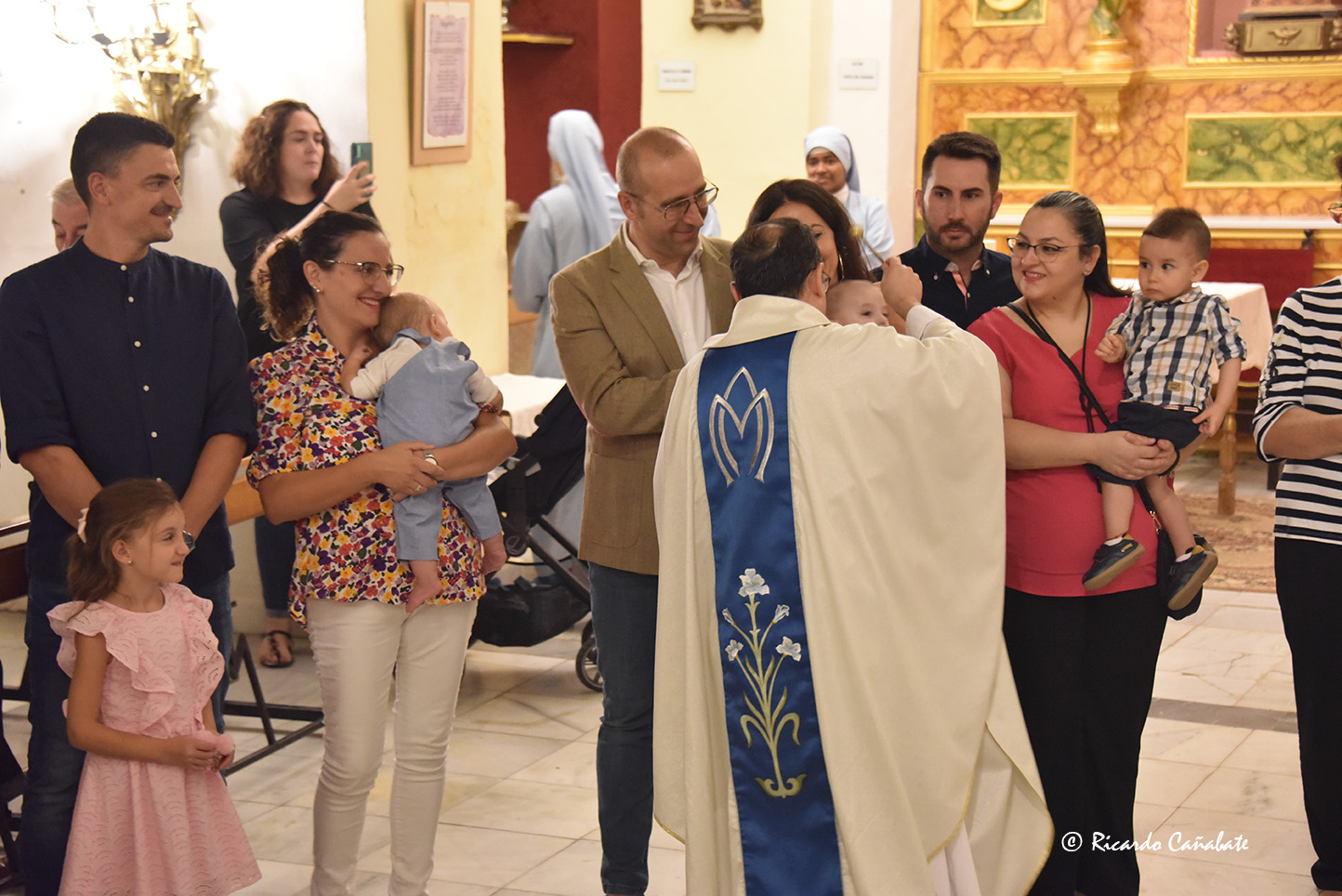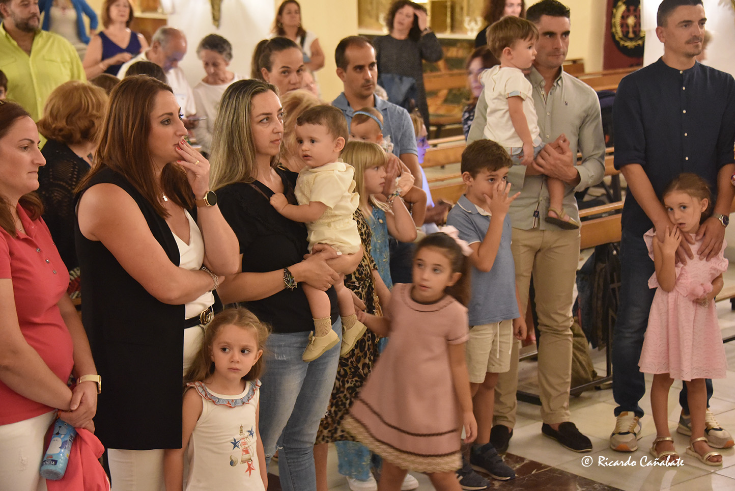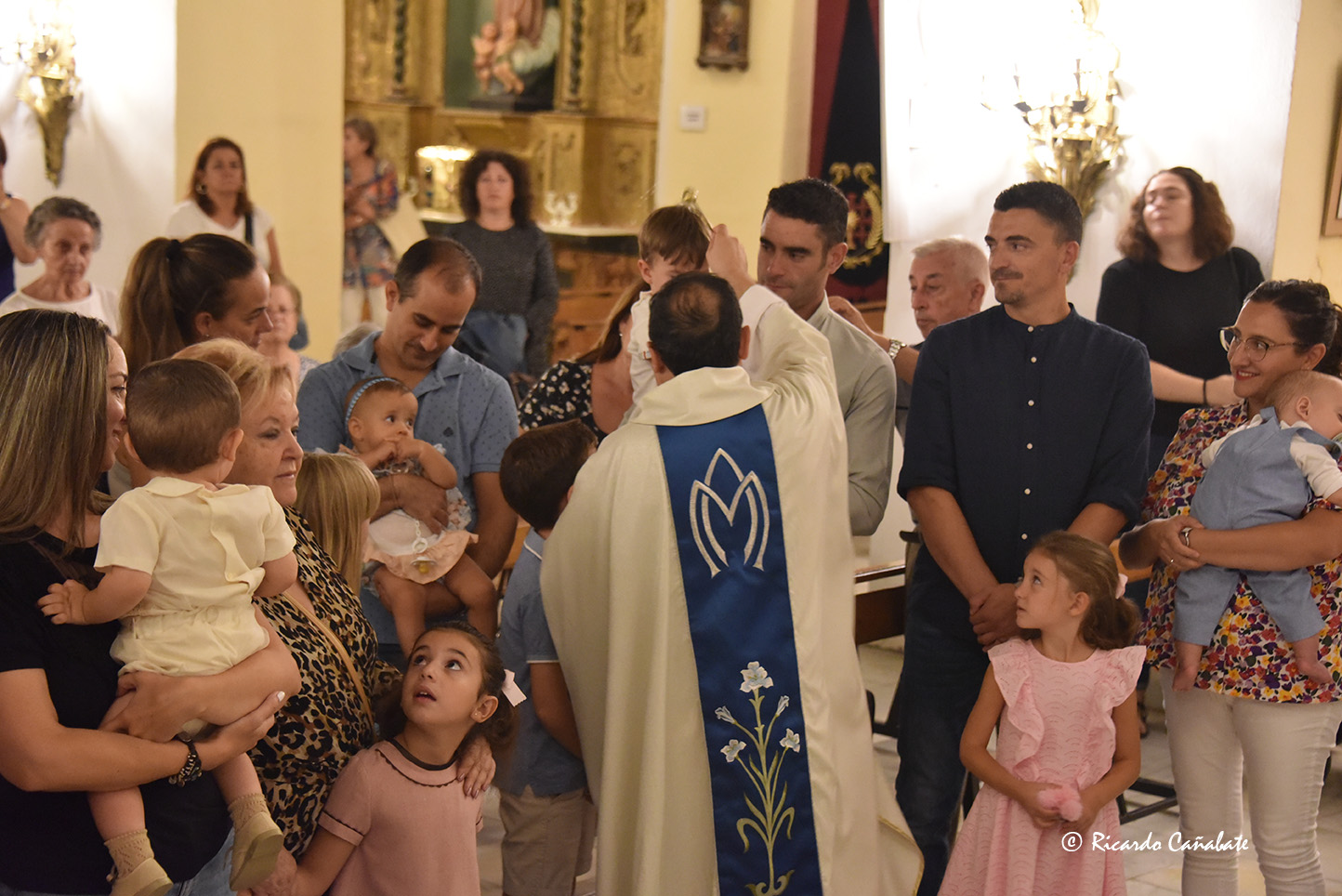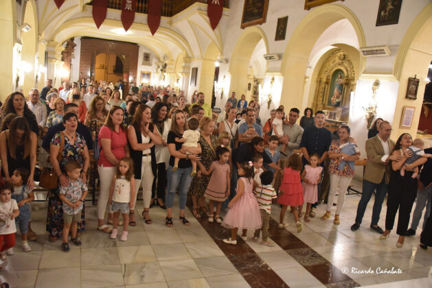 Finalizada la Eucaristía, el sacerdote llamó a todos los padres y madres que habían acudido para realizar la presentación de sus pequeños ante la Patrona, quienes formaron un semicírculo ante el altar en el que destacaban las caras de emoción ante un sencillo acto con el que muchos de estos pequeños eran protagonistas, por primera vez en su vida, ante la Virgen de la Piedad.