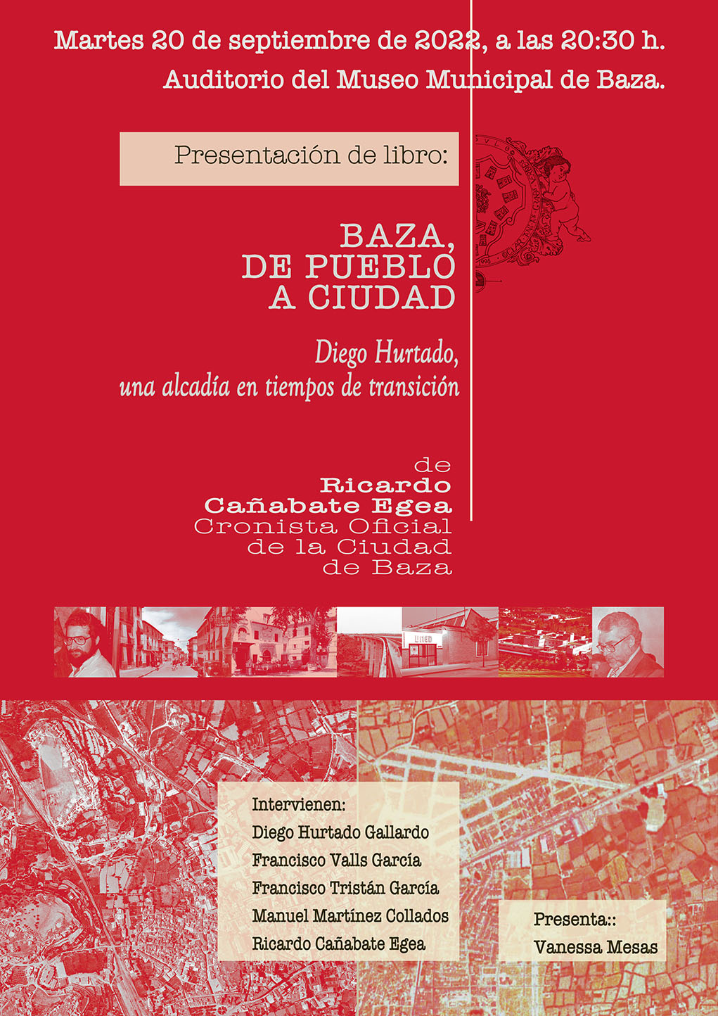 “Baza, de pueblo a ciudad” nuevo libro de Ricardo Cañabate que presenta la realidad de la evolución bastetana desde la transición y durante los cuatro mandatos de Diego Hurtado. Mañana martes, a las 20,30 horas, el auditorio del Museo Arqueológico Municipal de Baza acogerá la presentación del último libro de Ricardo Cañabate Egea, Cronista Oficial de la Ciudad de Baza, “Baza de pueblo a ciudad. Diego Hurtado, una alcaldía en tiempos de transición”, una obra que ha supuesto casi tres años de trabajo e investigación junto al que fuera primer alcalde democrático de Baza, durante las cuatro primeras legislaturas de esa nueva etapa.