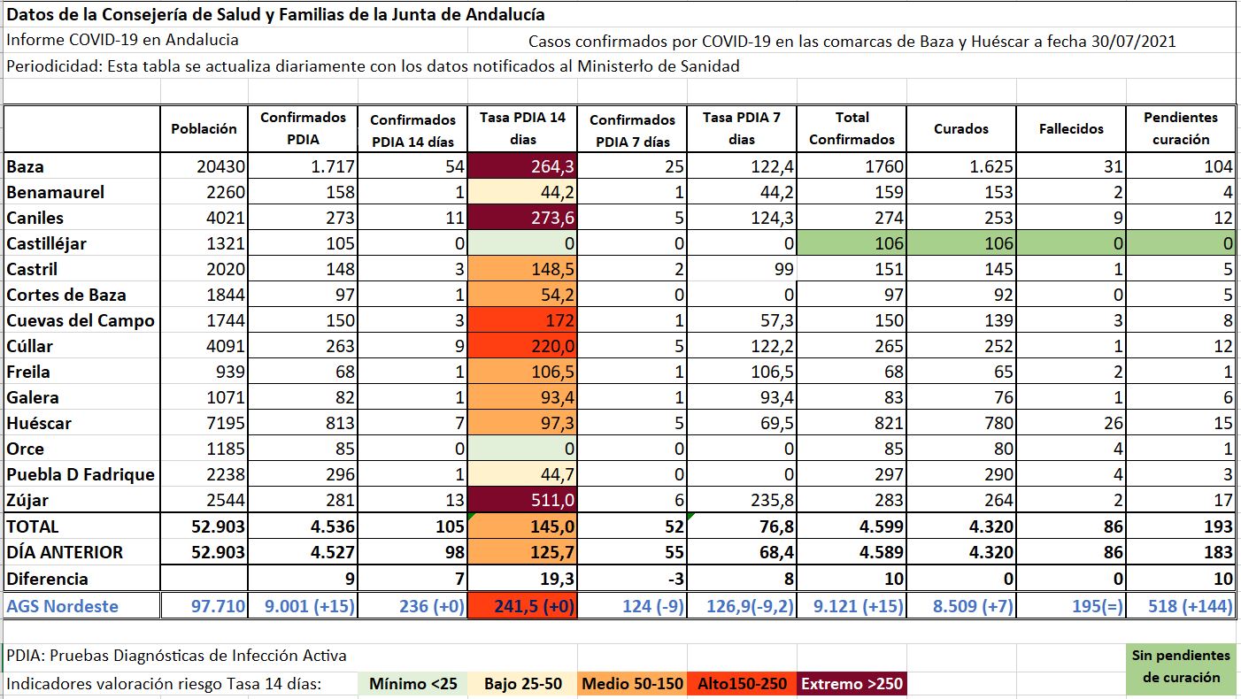 Los datos de la Consejería de Salud del pasado viernes dejaban ver un leve descenso en los nuevos contagios y algunos cambios significativos en las tasas de incidencia. Descenso en el que puede concretarse en casos como el de Baza, donde este viernes se detectaron dos nuevos positivos, cifra que mejora las últimas tendencias en esta ciudad. Además, Zújar sumaba 4 nuevos casos que disparan su tasa por encima de los 500 casos por 100.000 habitantes, mientras se detectaba un caso en cada una de las siguientes poblaciones: Benamaurel, Cuevas del Campo, Cúllar, Freila, Galera y Huéscar.