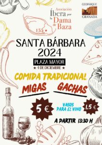 La Asociación Íbera por la Dama de Baza estará nuevamente este año en la festividad de Santa Bárbara, apoyando las tradiciones de Baza. El próximo 4 de diciembre, en la Plaza Mayor y a partir de las 13:30h, la Asociación Íbera por la Dama de Baza ofrecerá, a solo 5€, dos de las comidas más representativas de nuestra gastronomía: gachas colorás y migas con tajás, con las que acompañar la inauguración de la nueva temporada de Vinos del País que se celebra este día y para el que tendrán a la venta los típicos vasos de vino grabados a 1.5€.