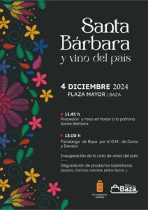 La festividad de Santa Bárbara es un evento muy especial para los bastetanos, que da inicio a esta tradicional campaña de Vino del País. Podremos disfrutar de una cata de los mejores vinos locales, acompañados del ritmo del grupo municipal de Coros y Danzas, que nos deleitará con nuestro Fandango de Baza.