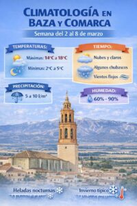 Llegados al jueves y viernes se volverán a mostrar una mezcla de nubes y claros, con temperaturas máximas estables alrededor de los 13 °C – 15 °C y un descenso notable de las mínimas durante las noches y madrugadas hacia valores cercanos a los 2 °C – 4 °C, típicos de la transición invernal-primaveral en zonas del interior como Baza. Hacia el sábado y domingo, algunos chubascos débiles dispersos podrían repetir, aunque con tendencia a mejorar por momentos.