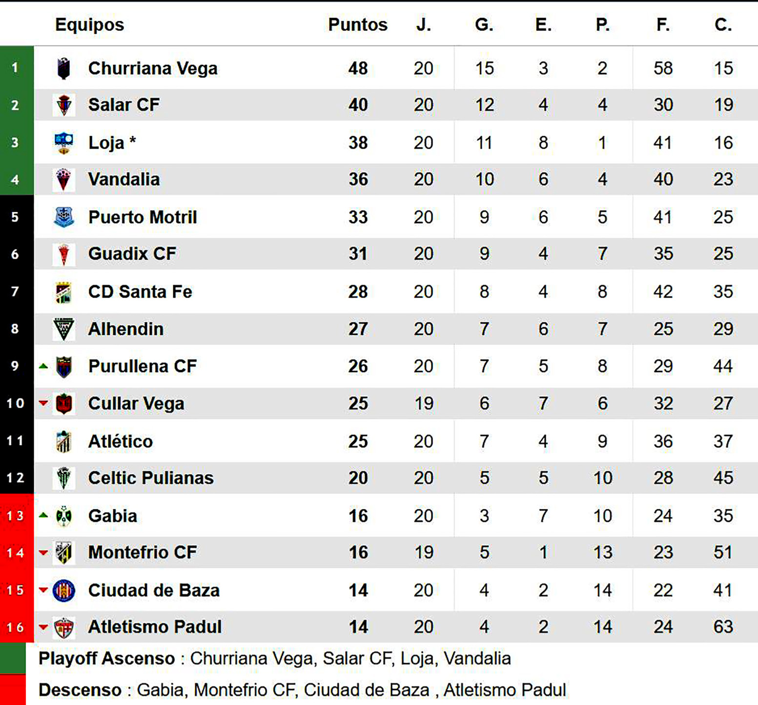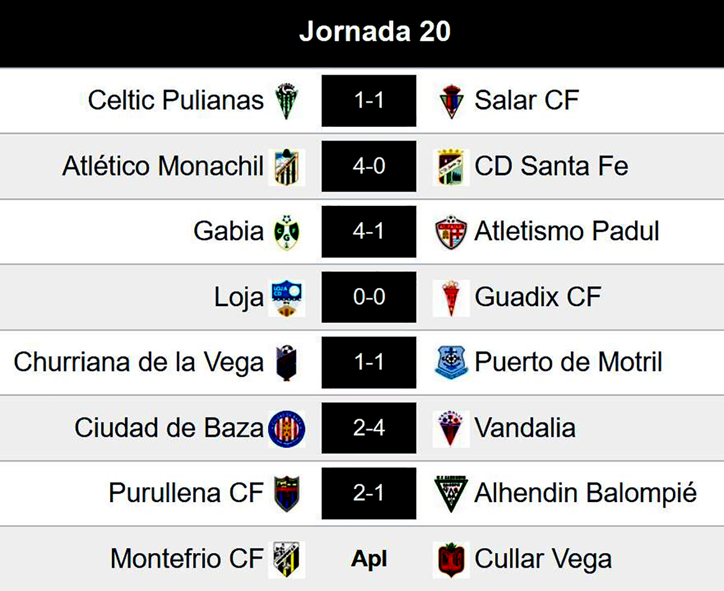 Resultados y clasificación en el grupo granadino de la Primera Andaluza Senior de Fútbol, tras la 20ª jornada (Clicar en las imágenes para ampliar).
