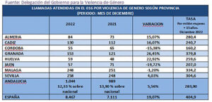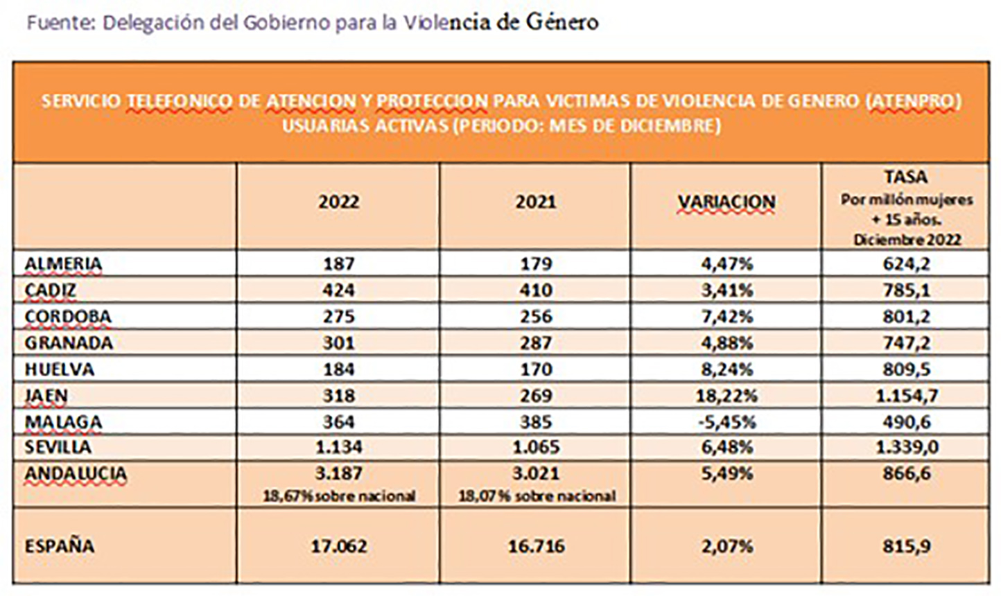 Además de las pulseras de control, las víctimas cuentan con otros medios para denunciar su situación y solicitar ayuda, como el servicio Atenpro de atención y protección mediante dispositivo electrónico con geolocalización y botón de emergencia para víctimas usuarias activas que a 31 de diciembre registró 3.187 actuaciones, un 5,5% más que en el mismo mes de 2021 y el 18,6% del total nacional (17.062 asistencias). La tasa de usuarias activas en Andalucía de este servicio en diciembre de 2022 es de 866,6 por millón de mujeres de 15 o más años, siendo la media nacional de 815,9.