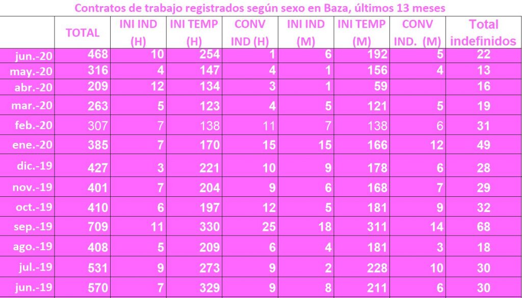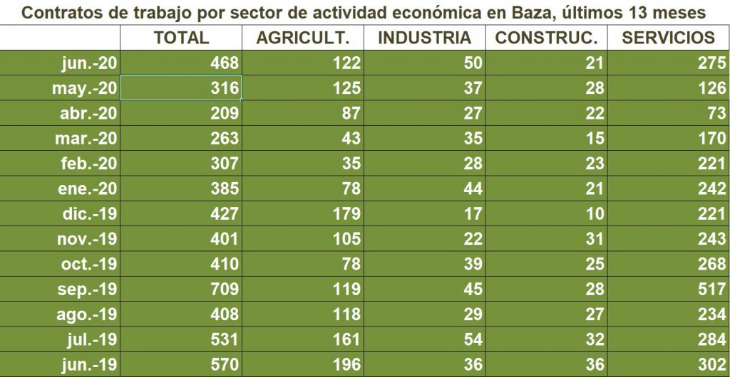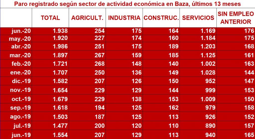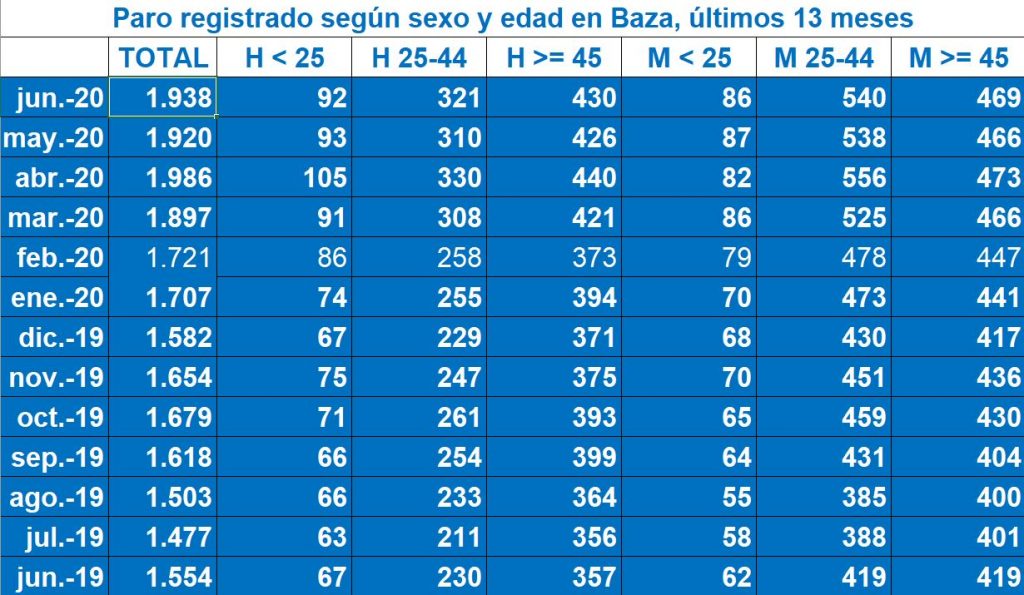 Movimiento mínimo en las cifras del paro en Baza durante el último mes. Con un leve aumento de 18 personas, las cifras del paro en nuestra ciudad no hacen sino acusar la incertidumbre de una situación en la que los Ertes y el coronavirus marcan todas las tendencias, de las que han sido los hombres de entre 25 y 44 años los que han salido más malparados, pues once de ellos han cesado en sus empleos, colaborando así a totalizar esas 1938 personas sin empleo que había al finalizar el mes de junio y a la que solo se han sumado la tercera parte de mujeres de esos 18 nuevos desempleados.