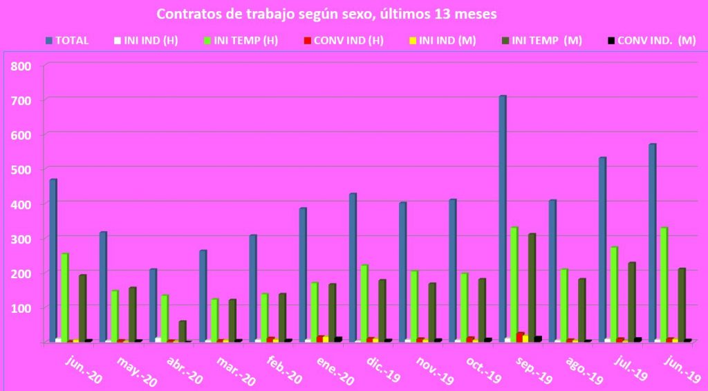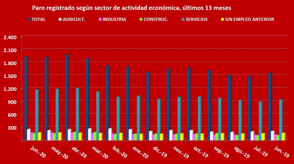También destacó el sector servicios con un aumento de 149 contratos firmados en esta última mensualidad, lo que propició un aumento total de 152 nuevas contrataciones, lo que supone pequeñas fluctuaciones en el resto de actividades y con la mejora del número de nuevas contrataciones con carácter indefinido, casi el doble que en mayo y siendo el tercer mejor mes en ese sentido, al sacar de la temporalidad a 11 hombres y otras tantas mujeres.