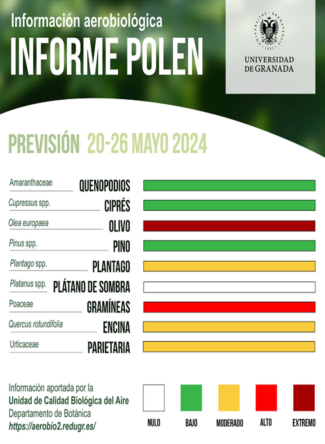 Además, conviene saber que las floraciones de la provincia de Granada son escalonadas, por la altura e influencia de Sierra Nevada, lo que conlleva que los niveles se mantengan extremos de forma más sostenida en el tiempo. Por ello, se recomienda extremar precauciones, para evitar los molestos síntomas de rinitis, conjuntivitis y en casos más severos, de procesos asmáticos.