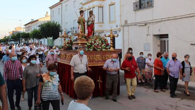 Como preludio de los días grandes de la localidad, más de un centenar de vecinos se echaron a la calle para acompañar en procesión al paso de sus patronos que, al son de la banda municipal, salieron desde su ermita para recorrer algunas de las arterias principales de Cortes de Baza y llegar hasta la parroquia.
