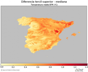Concretamente, el escenario más probable es que la temperatura media de estos tres meses se sitúe en el tercil superior. Eso supone que en la península y Baleares esa temperatura media trimestral estará, al menos, 0,7ºC por encima de lo normal, aunque en algunas zonas ese valor va a ser superior, como por ejemplo en el noreste peninsular.