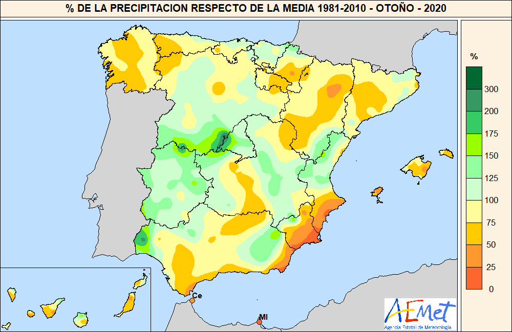 El balance meteorológico de AEMET califica al otoño que concluye como un periodo cálido y seco que nos lleva hacia un invierno que será también más cálido y seco de lo habitual. La Agencia Estatal de Meteorología (AEMET) ha hecho público su avance climático del otoño de 2020, que ha resultado cálido y seco para el conjunto de España. Hay que destacar que ninguno de los otoños de la actual década ha resultado frío. Es decir, los últimos diez otoños han sido, todos, más cálidos de lo normal. El de este año registró una temperatura media sobre la España peninsular de 14,8ºC. Esto es, 0,5ºC por encima de la media del período de referencia 1981-2010.