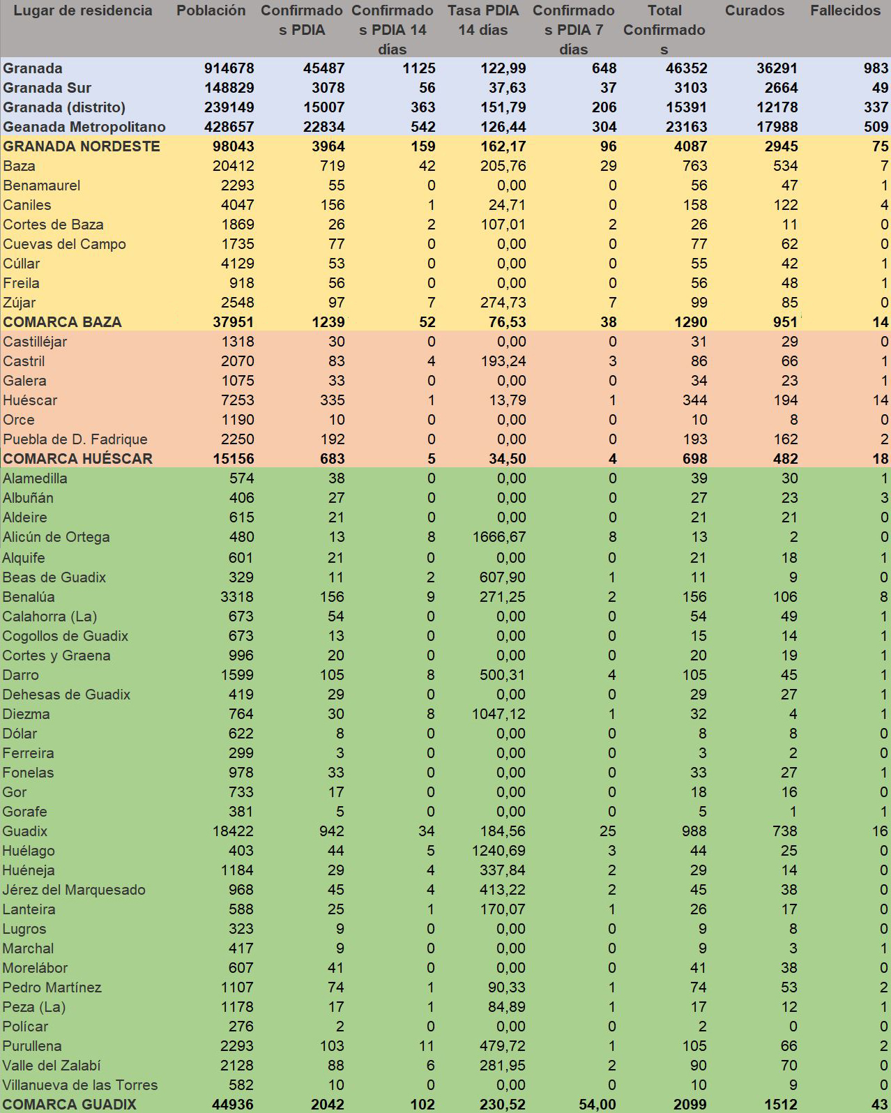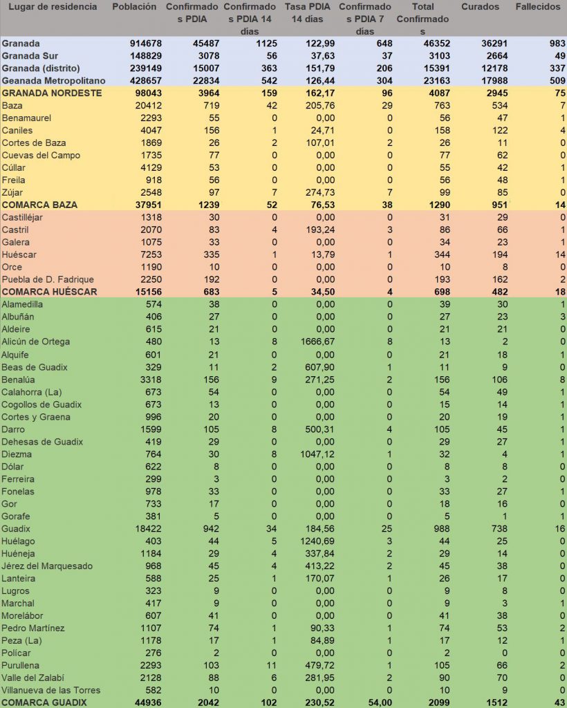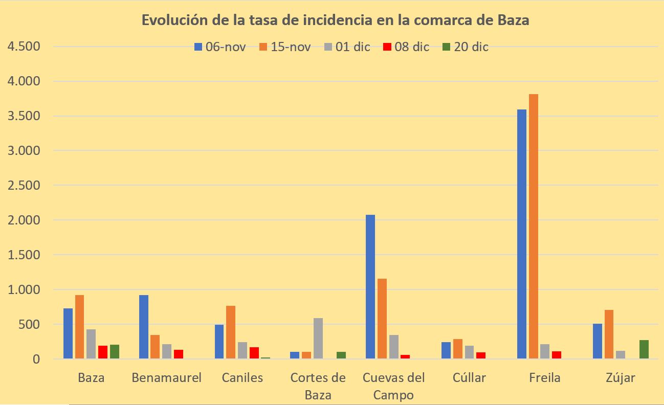 En el caso de la comarca de Baza, la tasa ha vuelto a bajar hasta los 76,53 casos por 100.000 habitantes y son ya cuatro los municipios con tasa cero: Benamaurel, Cuevas del campo, Cúllar y Freila, un municipio este último que dio la tasa más alta apenas hace unos días. Del resto, Caniles apenas tiene una tasa de 24,71 y Cortes, que estaba a cero, tiene ahora 107,01, mientras que Baza y Zújar se van hasta tasas de 205,76 y 274,73, respectivamente.