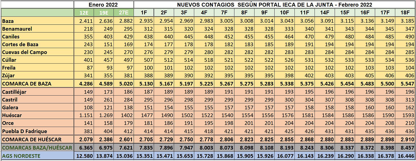 Las subidas del número de contagios en Baza y Castril arrastran a un aumento de la tasa de incidencia en las comarcas de Baza y Huéscar, mientras baja la del AGS Nordeste. 68 casos nuevos en total se registraban en el AGS Nordeste de Granada, según los datos facilitados por la Consejería de Salud y Consumo de la Junta de Andalucía, el pasado viernes, los cuales no se renovarán ya hasta que se vuelvan a facilitar hoy, conforme a la costumbre de publicarlos en torno al mediodía.
