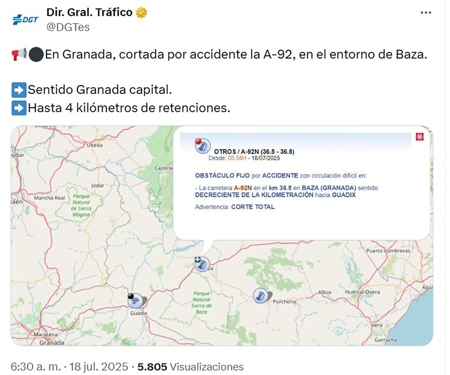 La A-92N es un corredor fundamental para el transporte de mercancías entre Andalucía oriental y el Levante español, lo que incrementa la densidad de tráfico pesado en este tramo. Según datos de la Dirección General de Tráfico (DGT), cerca de un 30% del tránsito diario en este punto corresponde a vehículos de gran tonelaje, lo que aumenta el riesgo de incidentes en caso de colisiones.
