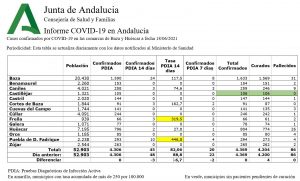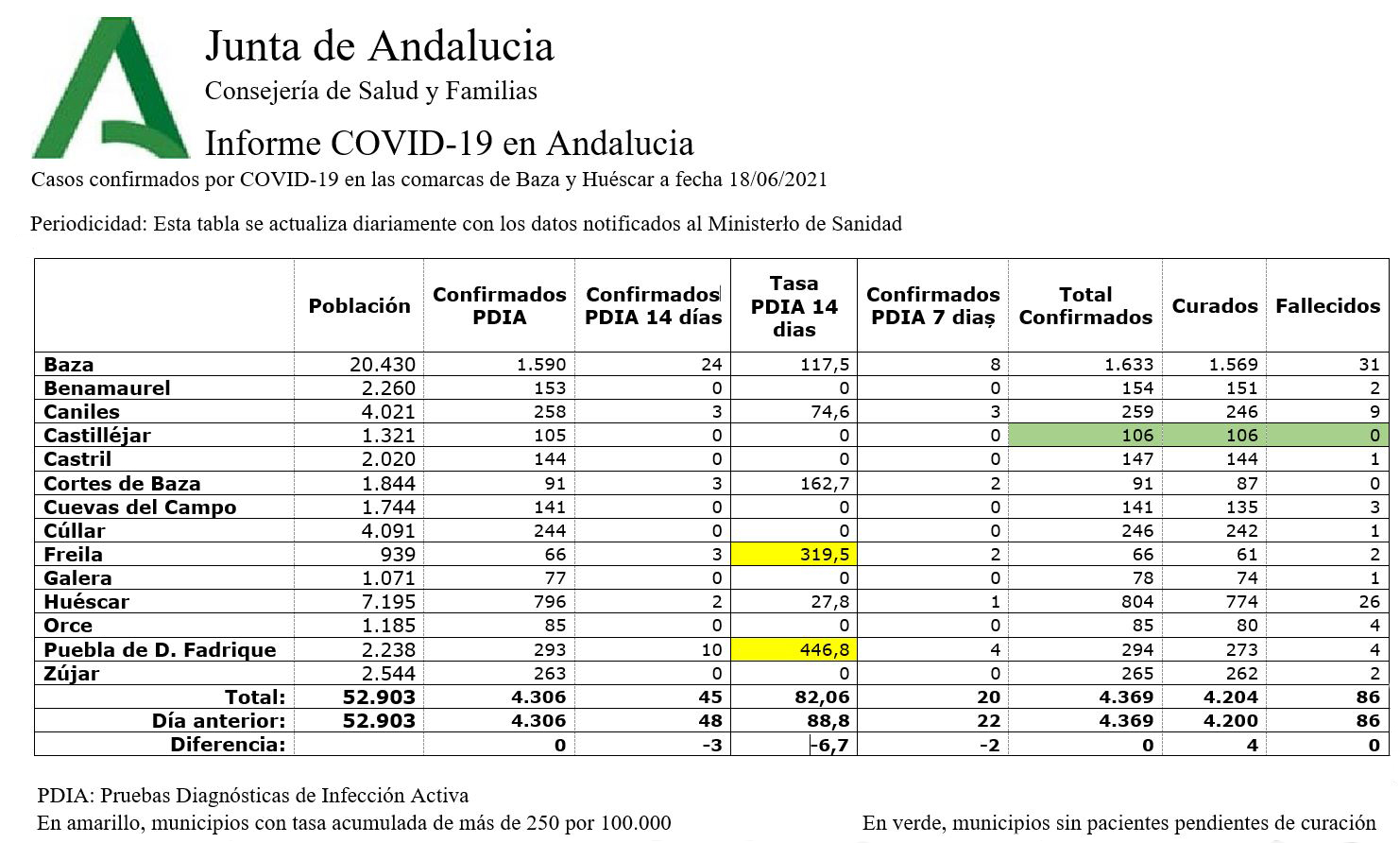 Por último, pocas variaciones en los datos que ofrecemos de la Consejería de Salud de la Junta de Andalucía, en la tabla que acompañamos a esta noticia y en la que se hace referencia a la evolución de la pandemia y la tasa de incidencia en las comarcas de Baza y Huéscar. Una información que hace referencia al viernes 18 de junio, en la que lo más destacado es la bajada de casos en La Puebla de don Fadrique, que baja ya de 500 su tasa de incidencia, al igual que hay un leve descenso en los confirmados a 7 y a 14 días y 4 nuevos curados.