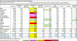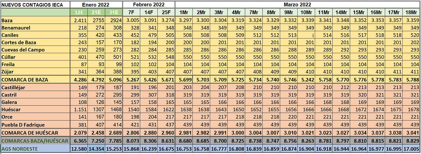 Sin disponer de datos nuevos durante el fin de semana, las últimas cifras corresponden a la comunicación ofrecida por la Consejería de Salud de la Junta de Andalucía el pasado viernes, en la que Baza añadía dos nuevos contagios por Covid, cifra que llegaba hasta 8 en las comarcas de Baza y Huéscar, al añadir tres casos más Huéscar, otros dos Caniles y uno más en Cortes de Baza, localidad que perdía por ello sus tasas de incidencia cero, a la par que pasaba al nivel sanitario “Bajo”.