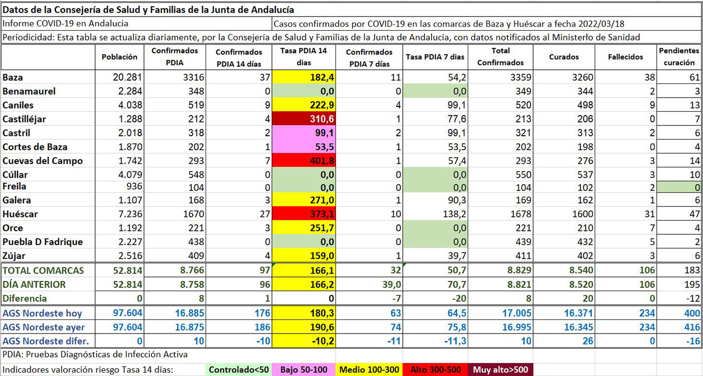En cuanto a las cifras de nuevos curados, seguían en datos inferiores a las semanas precedentes, añadiendo 20 en las comarcas de Baza y Huéscar y 6 más en el AGS Nordeste, tras lo que quedan 183 personas pendientes de curación en las comarcas de Baza y Huéscar y 400 en el AGS Nordeste.
