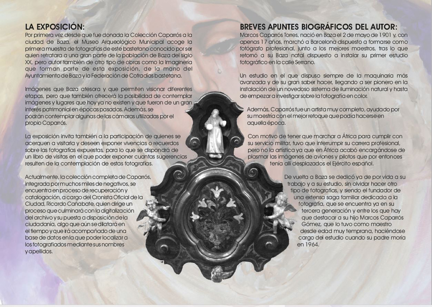 Tal y como se recuerda en el díptico de la exposición, Marcos Caparrós Torres nació en Baza el 2 de mayo de 1901 y, con apenas 17 años, marchó a Barcelona dispuesto a formarse como fotógrafo profesional, junto a los mejores maestros, tras lo que retornó a su Baza natal dispuesto a instalar su primer estudio fotográfico en la calle Serrano. Un estudio en el que dispuso siempre de la maquinaria más avanzada y de su gran saber hacer, llegando a ser pionero en la instalación de un novedoso sistema de iluminación natural y hasta de empezar a investigar sobre la fotografía en color. Caparrós fue además un artista muy completo, ayudado por su maestría con el mejor retoque que podía hacerse en esa época.