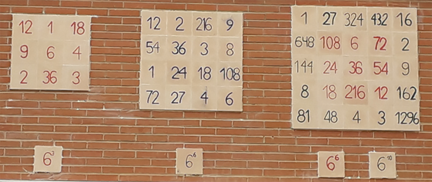 En la fachada de entrada al I.E.S. José de Mora de Baza hay tres cuadrados mágicos multiplicativos, desde el jueves 3 de marzo de 2022. En la parte inferior de cada uno de ellos se indica la constante mágica.