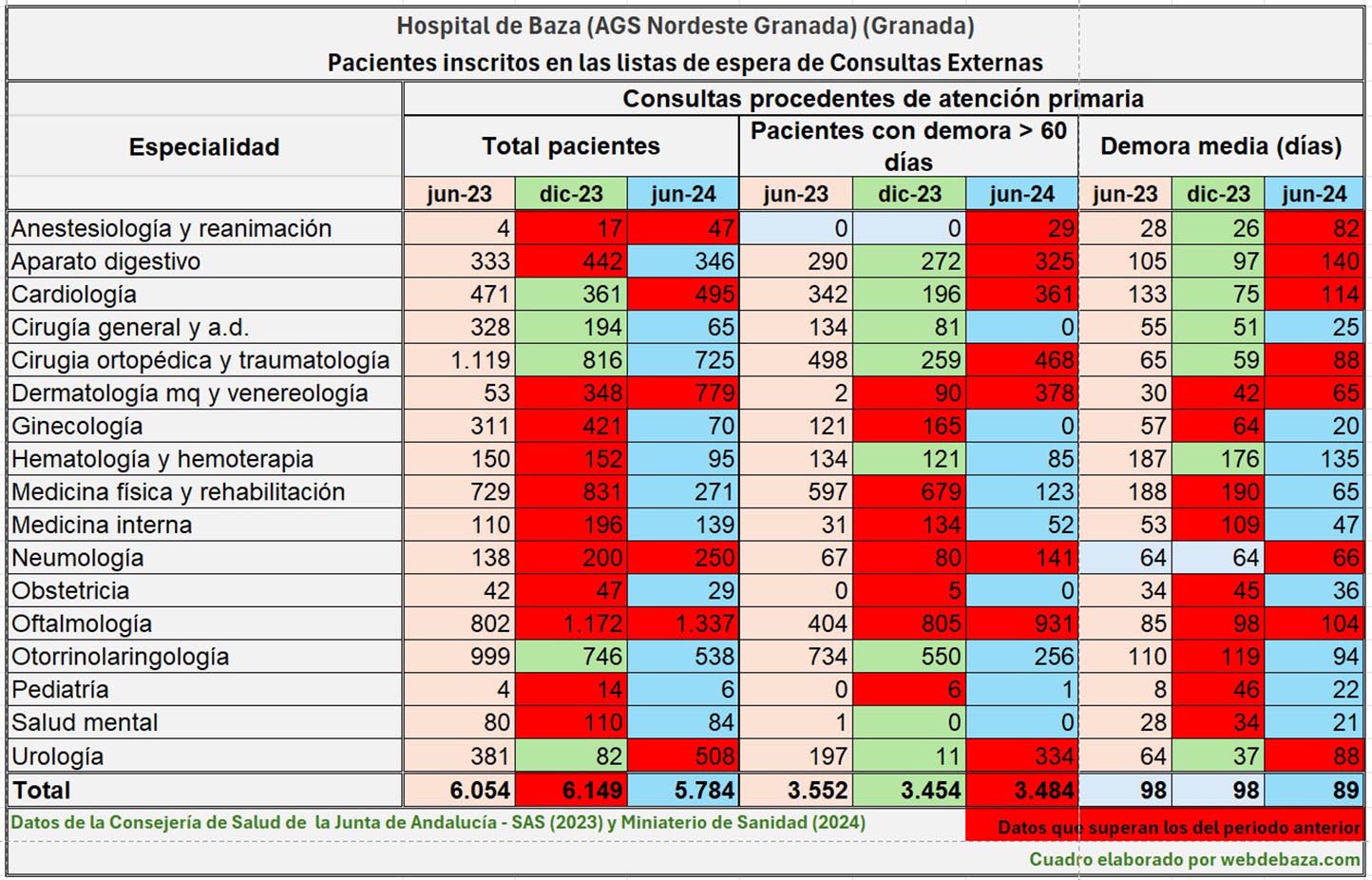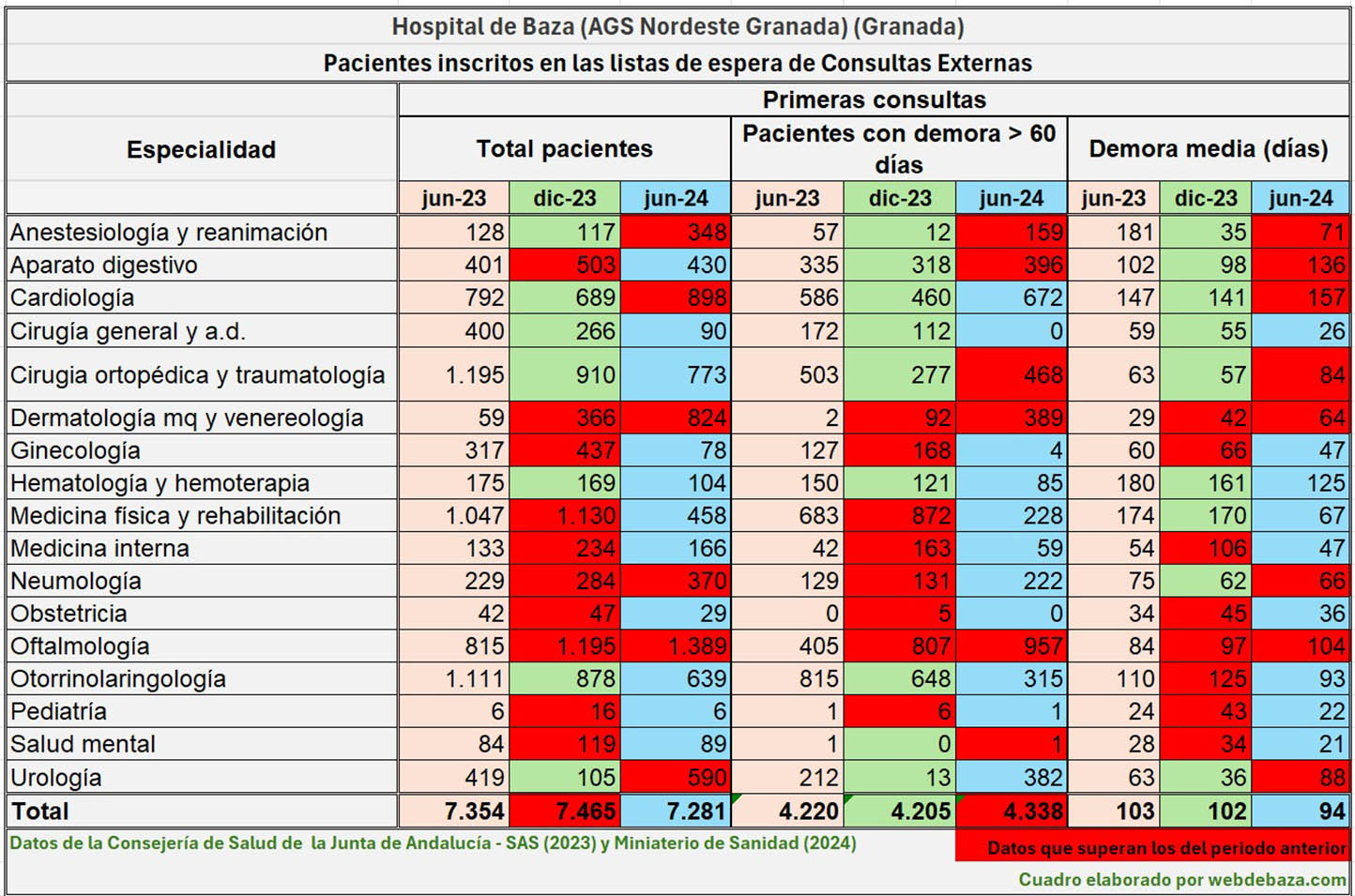 Mientras tanto, en Baza la situación ha cambiado, a mejor en unos aspectos y a peor en otros, lo que vamos a tratar de desgranar con unas tablas en las que diferenciamos dos tipos fundamentales de esperas: para operarse o para consultar a un especialista,