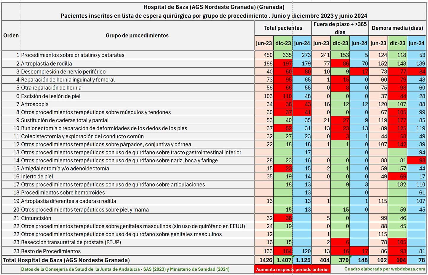 Las listas de espera quirúrgica en el Hospital de Baza mejoran notablemente. Listas que comparamos con la anterior situación en la que los datos fueron facilitados por la Junta de Andalucía, referidos a final de diciembre de 2023, tras empeorar notablemente la situación de seis meses antes, y recuperar menores posiciones a final de junio de 2024.
