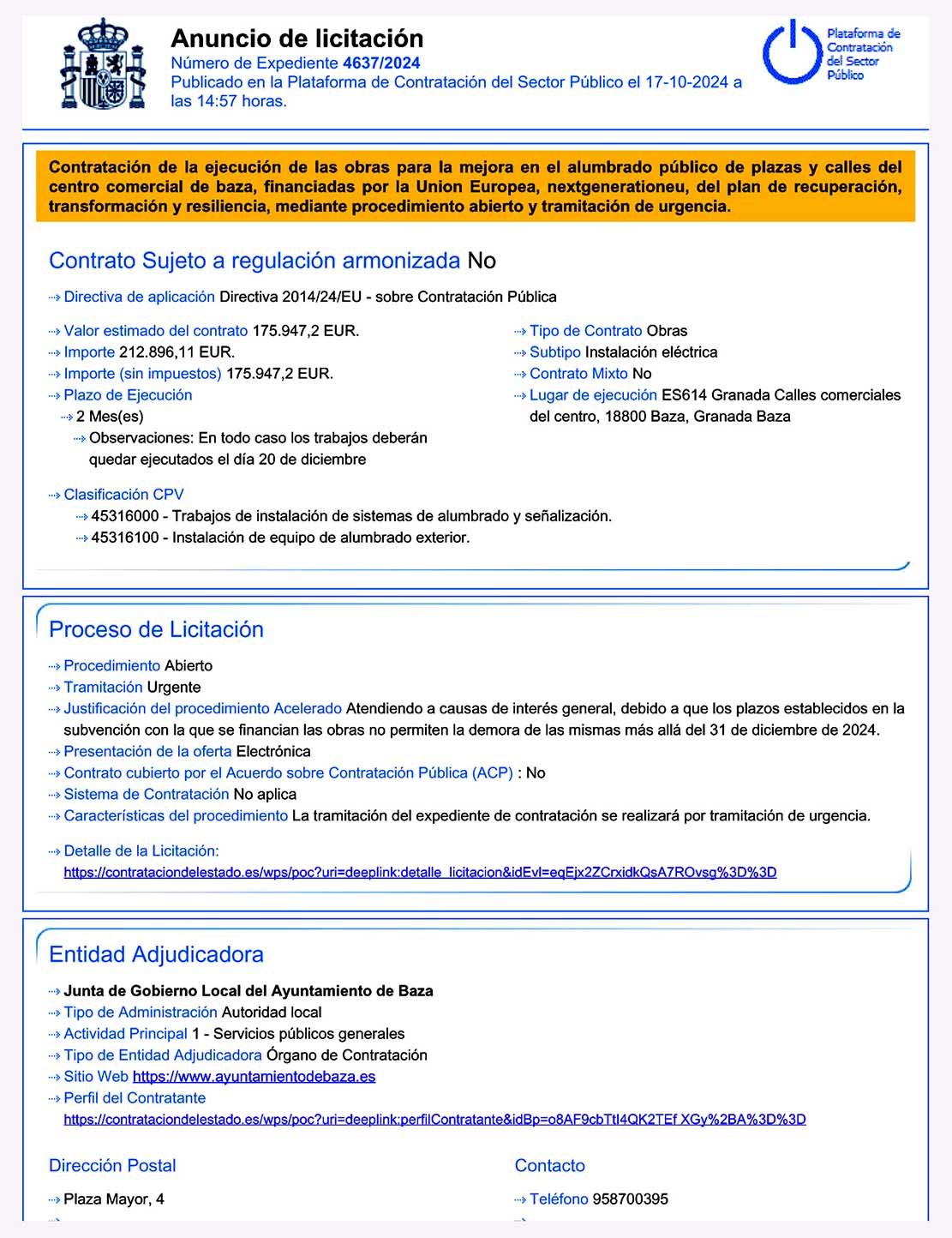 En periodo de licitación la ejecución de obras para la mejora del alumbrado público de plazas y calles del centro comercial de Baza. Ya está publicado en la Plataforma de Contratación del Sector Público el anuncio que rige la contratación de la ejecución de las obras para la mejora en el alumbrado público de plazas y calles del centro comercial de Baza, financiadas por la Unión Europea, Next Generation EU, del Plan de Recuperación, Transformación y Resiliencia, mediante procedimiento abierto y tramitación de urgencia.