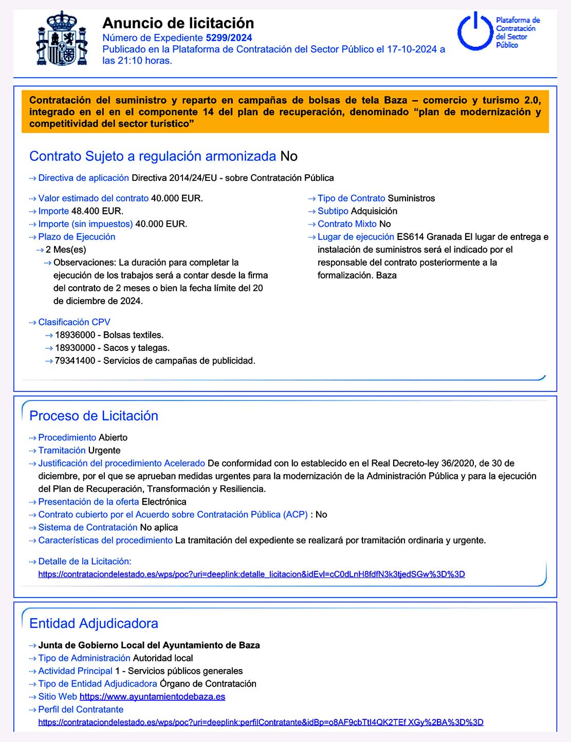 En licitación el suministro y reparto en campañas de bolsas de tela con un presupuesto base de 48.400 euros, IVA incluido. La Plataforma de Contratación del Sector Público tiene publicado ya el anuncio de licitación que rige la contratación del suministro y reparto en campañas de bolsas de tela Baza – comercio y turismo 2.0, integrado en el componente 14 del Plan de Recuperación, denominado “Plan de modernización y competitividad del sector turístico”.