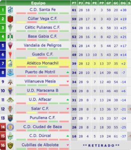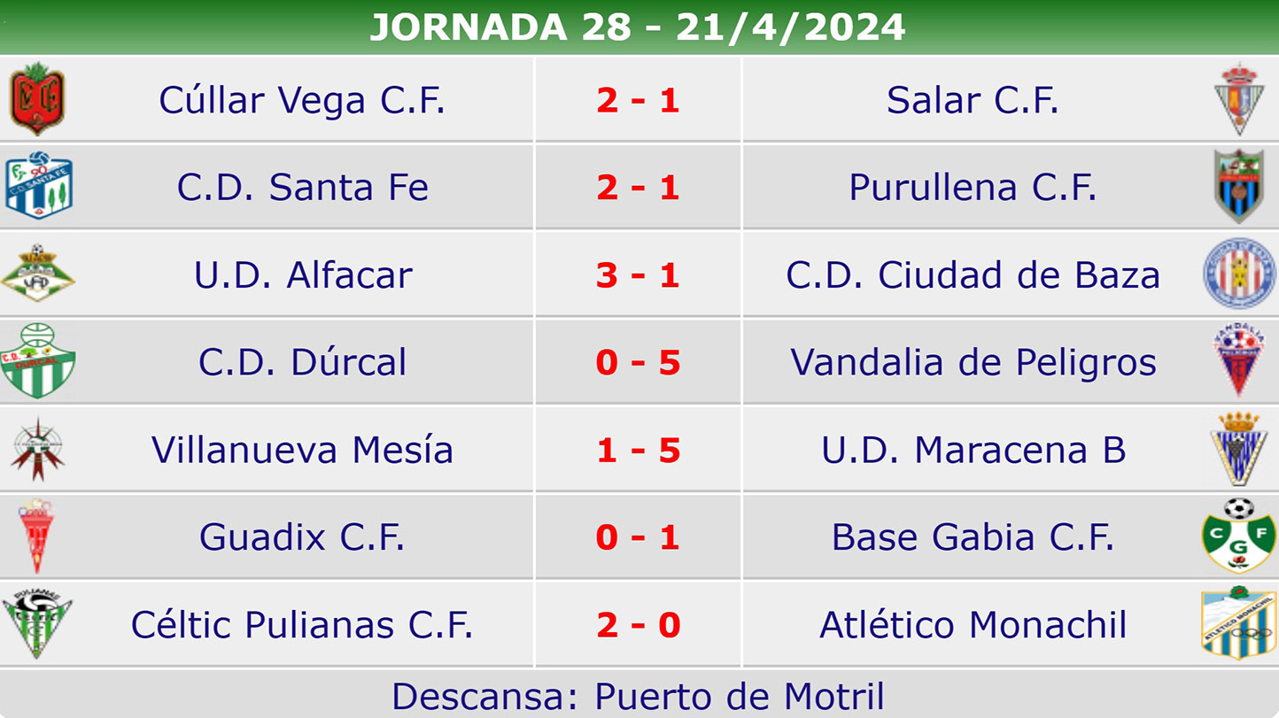 Resultados y clasificación tras la jornada 28 en el grupo granadino de la Primera Andaluza Senior de Fútbol. (Clicar en las imágenes para ampliarlas):