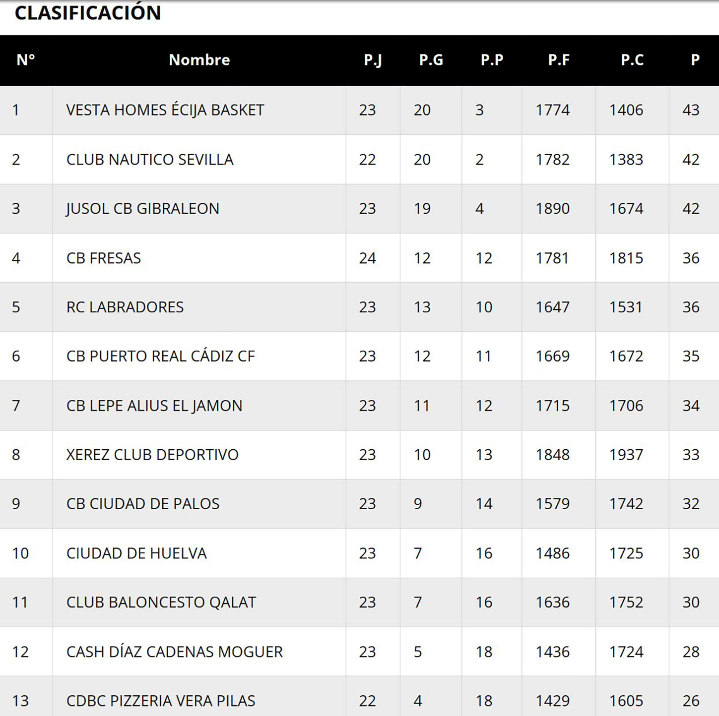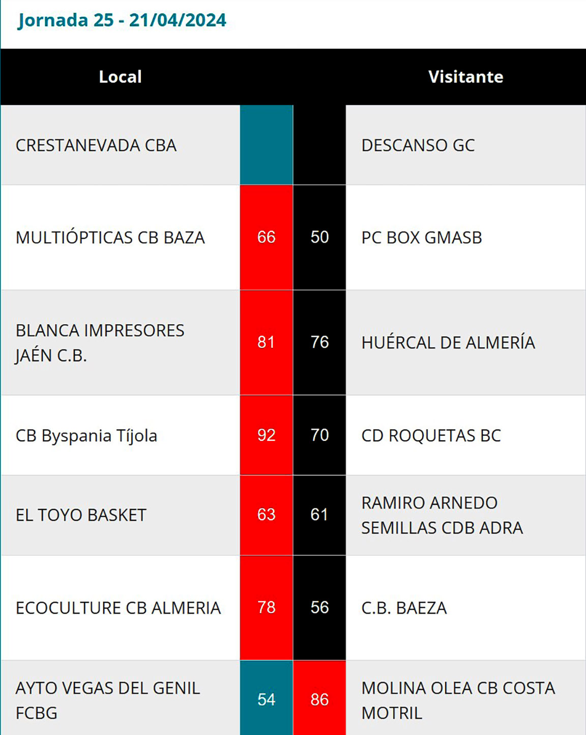 Resultados y clasificación tras la jornada 25 en el grupo C de la Primera Nacional Andaluza de Baloncesto. (Clicar en las imágenes para ampliarlas):