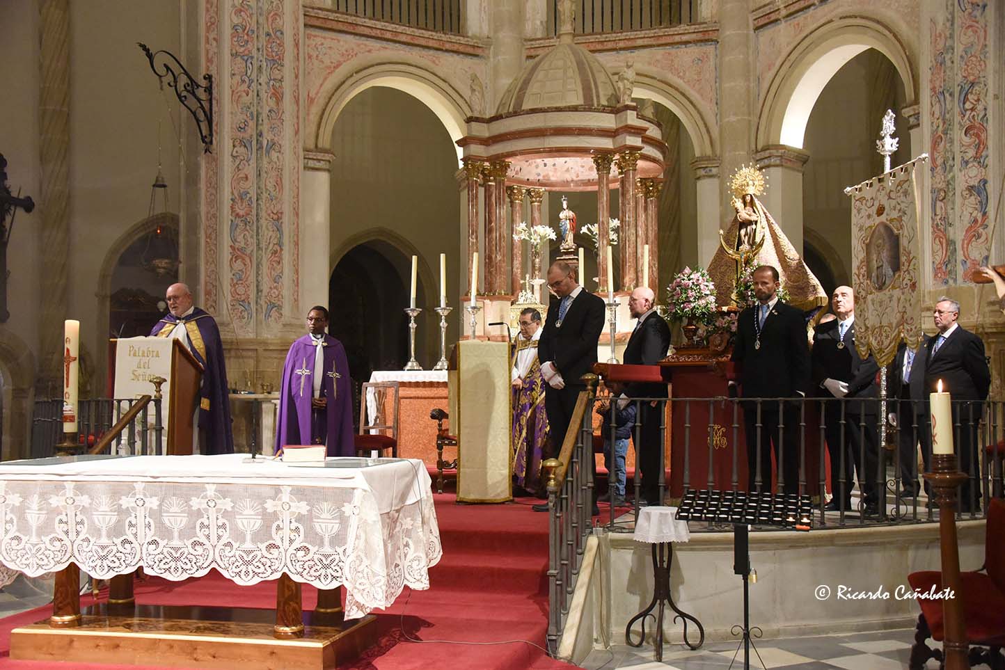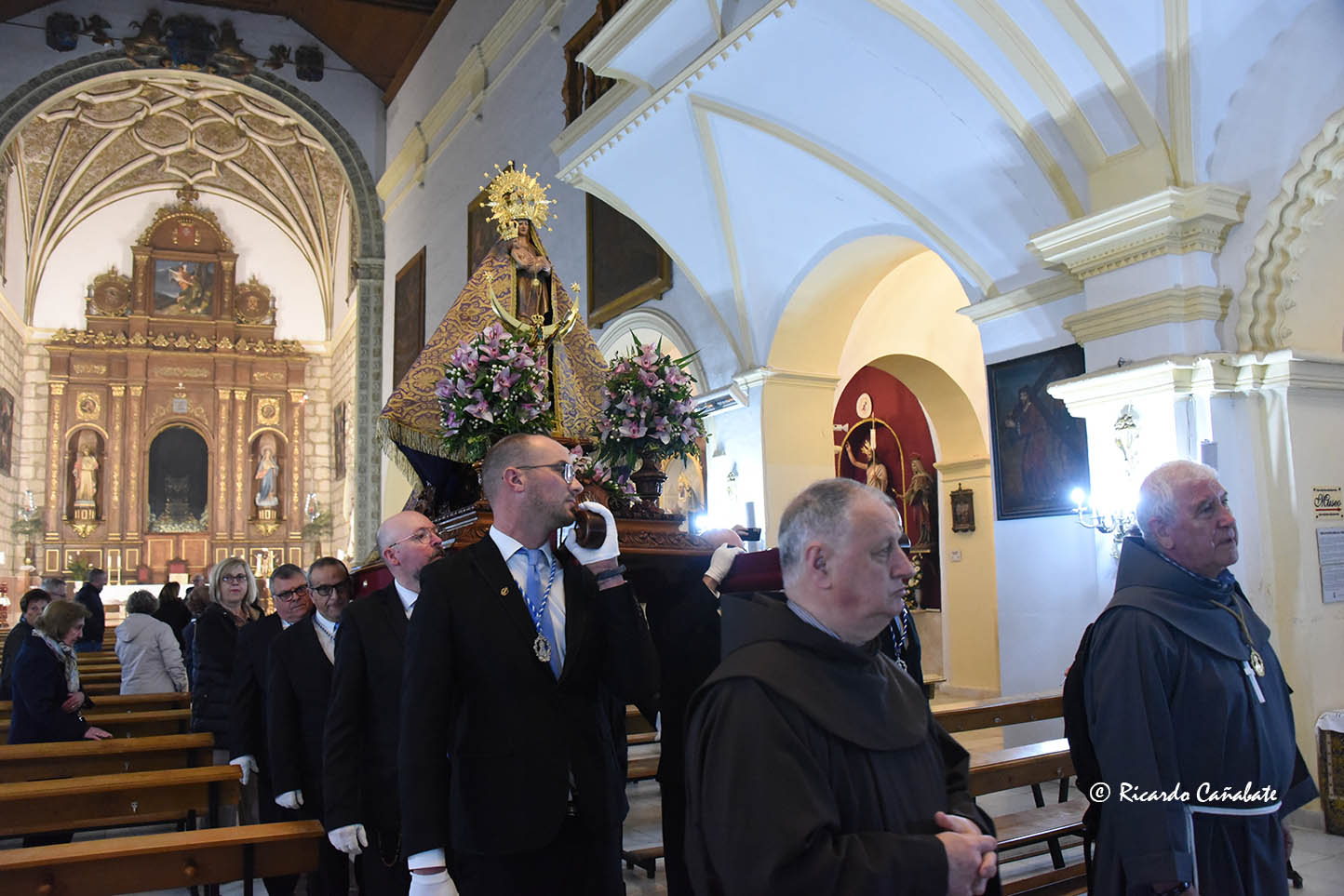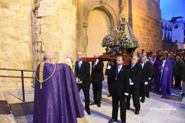 Así, este último sábado ya aguardaba su traslado la imagen de Ntra. Sra. De la Piedad, colocada en sus andas desde el día previo y mientras se celebraban el rezo del Santo Rosario, la Misa y la Sabatina de Despedida, en el antiguo templo mercedario y franciscano. A su término, se organizaba la procesión de traslado hacia la Iglesia Mayor, con una notable participación de fieles y la imagen portada a hombros de su Cuerpo de Horquilleros, transitando por a Plaza de San Juan, Zapatería y Arco de la Magdalena para, llegada a las inmediaciones de este otro templo, ser recibida por su párroco y trasladada hasta el altar mayor.