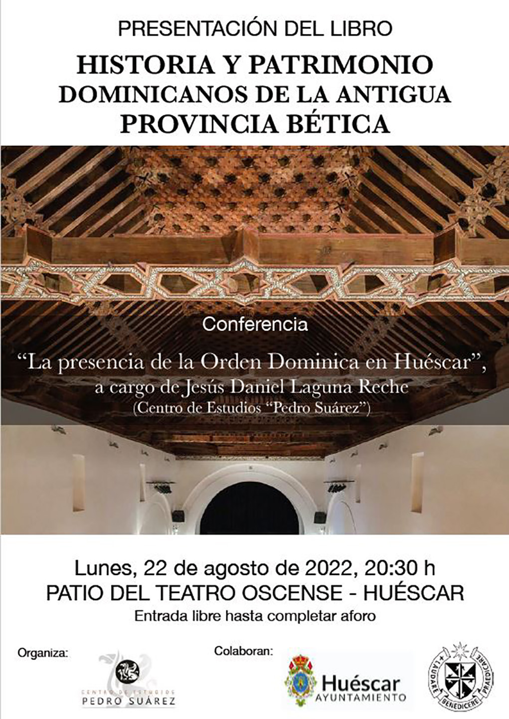 El Teatro oscense acoge la presentación del libro “Historia y Patrimonio Dominicanos de la antigua provincia Bética”. El Centro de Estudios «Pedro Suárez» organiza, con la colaboración del Ayuntamiento de Huéscar, el acto de presentación del libro «Historia y patrimonio dominicanos de la antigua provincia Bética».
