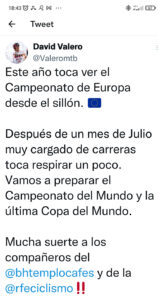 El ciclista bastetano era consciente de que su calendario de preparación le exigía que viera esta competición por la televisión, “tras un mes de julio muy  cargado de carreras, lo que hace que toque respirar un poco”. Y es que David Valero está metido de lleno en la preparación del Campeonato del Mundo y de la última prueba de la Copa del Mundo, donde están fijados sus principales objetivos del calendario de este año y a los que llega, como ha demostrado en las últimas semanas, dispuesto a optar a todo y confiando en que tiene las necesarias cartas con las que luchar para lograr metas que ningún ciclista español ha logrado hasta ahora.