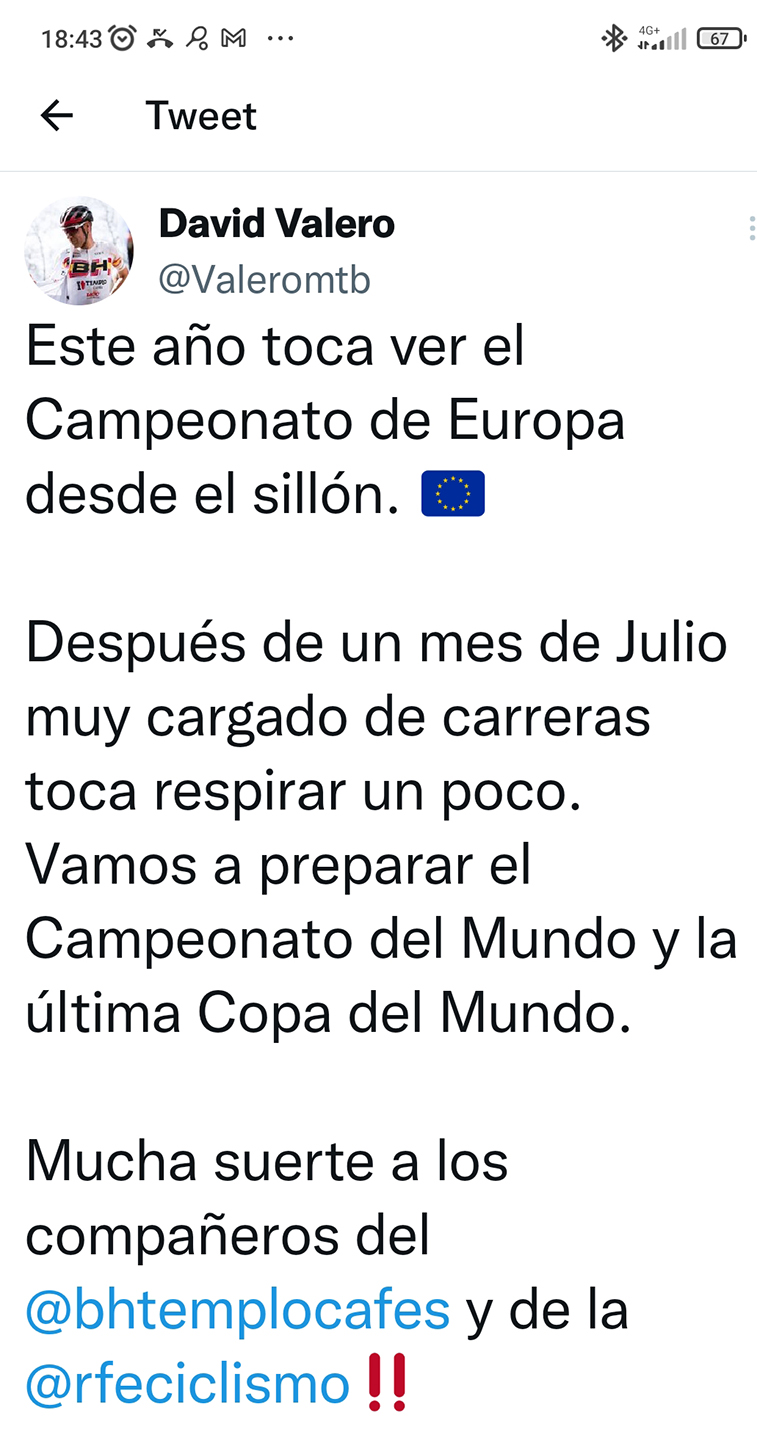 El ciclista bastetano David Valero renuncia a participar en el Campeonato de Europa de Ciclismo, como parte de su estrategia para el Campeonado Mundial y la Copa del Mundo. El pasado fin de semana se celebraba en Múnich el Campeonato de Europa de XCO, dentro de la competición que ha elegido a los campeones continentales de las diferentes modalidades ciclistas, entre las que estaba la especialidad XCO en la que compite nuestro paisano David Valero.