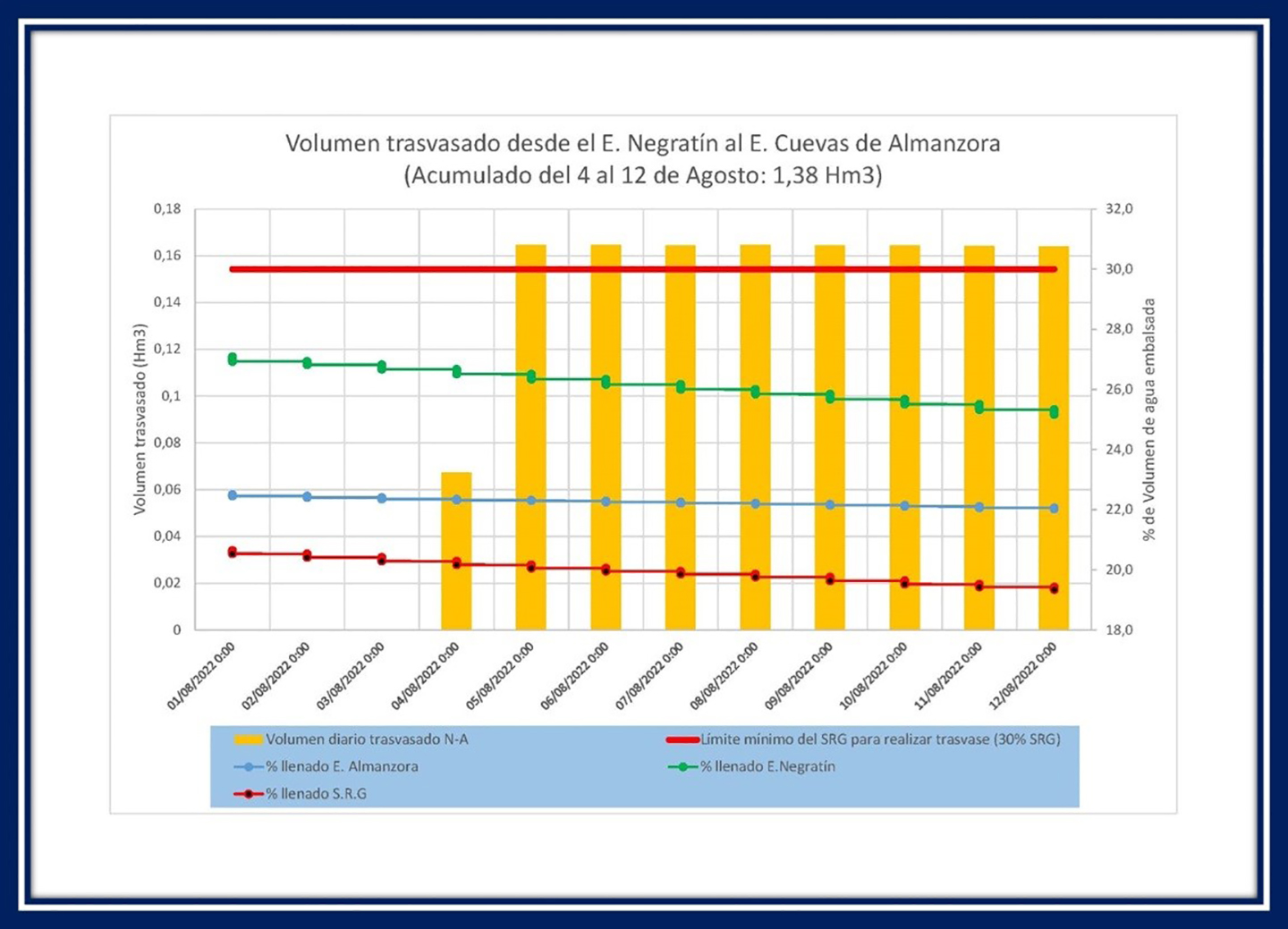 Con este marco, la propia Confederación Hidrográfica del Guadalquivir, el pasado 26 de julio se ratificaba en los acuerdos de la comisión de desembalse del 11 de Mayo entre los que destacaba la imposibilidad de afrontar transferencias por el trasvase Negratín Almanzora dada la escasez de los recursos hídricos de los sistemas de la Cuenca. A pesar de ello, desde el 4 de agosto se está trasvasando un caudal medio de aproximadamente 1,9 m3/s al día acumulándose desde el 04 de agosto un total de 2,20 Hm3 aproximadamente hasta el 17 de agosto.