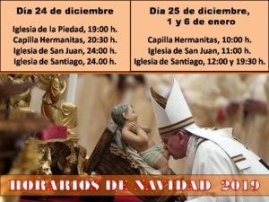 La Parroquia de San Juan hace públicos sus horarios de misas para los días festivos de esta Navidad. Unos horarios que hacen referencia a las diferentes iglesias que están a cargo de esta parroquia, conforme exponemos a continuación: