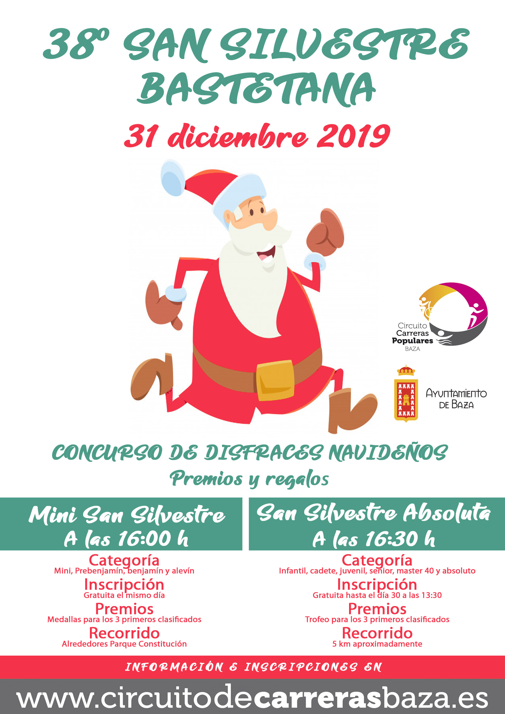 Abierto el plazo para la San Silvestre que incorpora un sorteo de 150 euros en material deportivo, mantiene los premios para disfrazados y modifica parte del recorrido. Deporte y buen humor se unen en Baza en la carrera popular San Silvestre que, en su 38 edición, incorpora nuevos premios y sorteos, mantiene el concurso de disfraces y renueva parte de su itinerario de 5 kilómetros por el centro de la ciudad, para hacer que la prueba sea totalmente urbana.