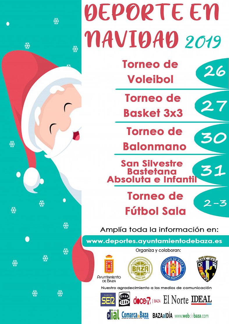 Por otro lado, durante las fiestas de Navidad, la actividad deportiva en Baza se intensifica con la celebración de cuatro torneos que se celebrarán entre el 26 de diciembre y el 3 de enero. Se han programado para el 26 de diciembre el Torneo de Voleibol, el 27 se celebrará el Torneo de Basket 3 x3, para el día 30 el Torneo de Balonmano y para los días 2 y 3 de enero el Torneo de Fútbol Sala.