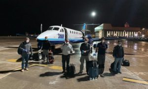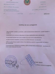 Viajaron hasta la capital mauritana, Nuakchot, para intentar fletar un avión y salir del país. Se hicieron la prueba del coronavirus, que dio negativo, para que las autoridades mauritanas les dejaran viajar, pero aun así tuvieron que «remover cielo y tierra» para contactar con el ministro mauritano y que les permitiera abandonar el país. Tras denegarles salir en dos aviones anteriores, finalmente «el ministro nos dejó volar con un permiso excepcional», para lo cual tuvieron que realizar múltiples gestiones, ayudados también por la embajada española y otras autoridades nacionales.