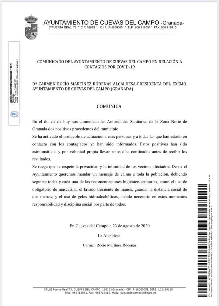 Los dos positivos de Cuevas del Campo se comunicaban directamente por las autoridades sanitarias de la zona norte de Granada al ayuntamiento cueveño, según comunicado emitido por la alcaldesa de la localidad, Carmen Rocío Martínez Ródenas.