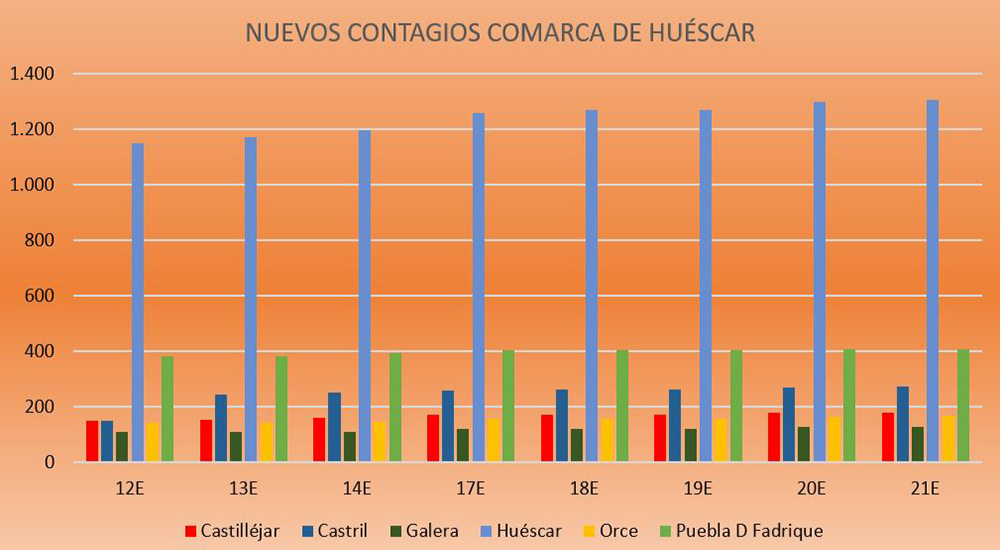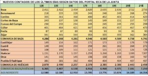 Subida moderada de contagios en los datos del viernes y bajada de tasas, sobre todo la de 7 días en una nueva jornada sin fallecimientos. Los datos ofrecidos desde el portal del IECA de la Consejería de Salud y Familias, sobre la Covid-19 registraban el pasado viernes una subida moderada de contagios (69) en la mayoría de los municipios de las comarcas de Baza y Huéscar, teniendo en cuenta que algunos municipios permanecieron ya sin aumentar contagios, como fue el caso de Cortes de Baza (157), Freila (93), Galera (126) y La Puebla de don Fadrique (407), que no sumaron nuevos contagios, mientras que Castilléjar sumaba uno solo y pasaba de 178 a 179 y Zújar que solo sumaba dos contagios más, pasando de 362 a 364.