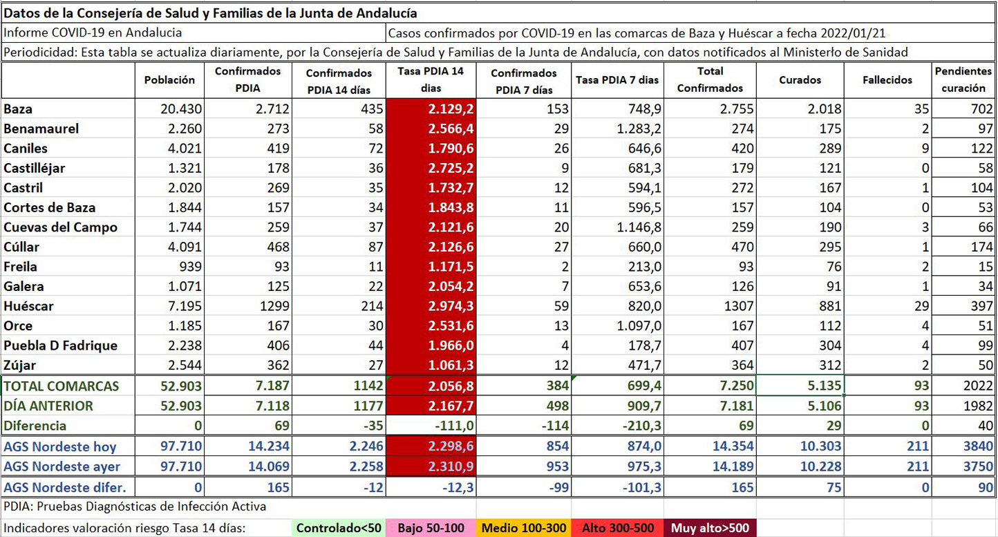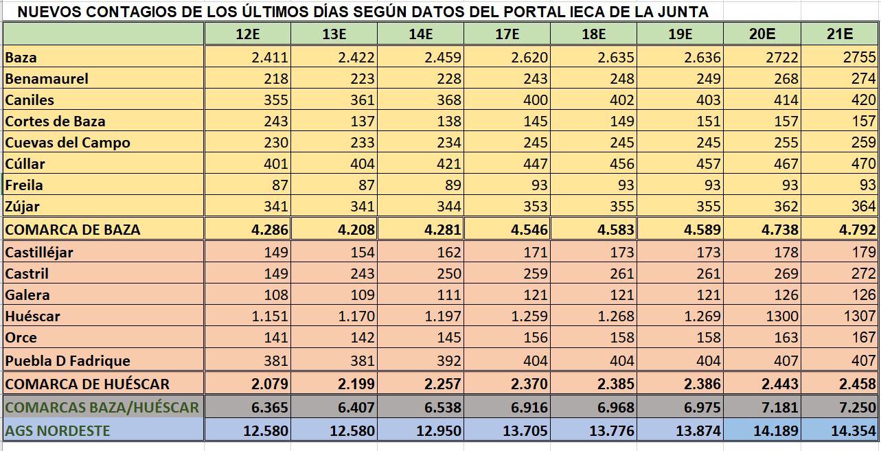 Subida moderada de contagios en los datos del viernes y bajada de tasas, sobre todo la de 7 días en una nueva jornada sin fallecimientos. Los datos ofrecidos desde el portal del IECA de la Consejería de Salud y Familias, sobre la Covid-19 registraban el pasado viernes una subida moderada de contagios (69) en la mayoría de los municipios de las comarcas de Baza y Huéscar, teniendo en cuenta que algunos municipios permanecieron ya sin aumentar contagios, como fue el caso de Cortes de Baza (157), Freila (93), Galera (126) y La Puebla de don Fadrique (407), que no sumaron nuevos contagios, mientras que Castilléjar sumaba uno solo y pasaba de 178 a 179 y Zújar que solo sumaba dos contagios más, pasando de 362 a 364.