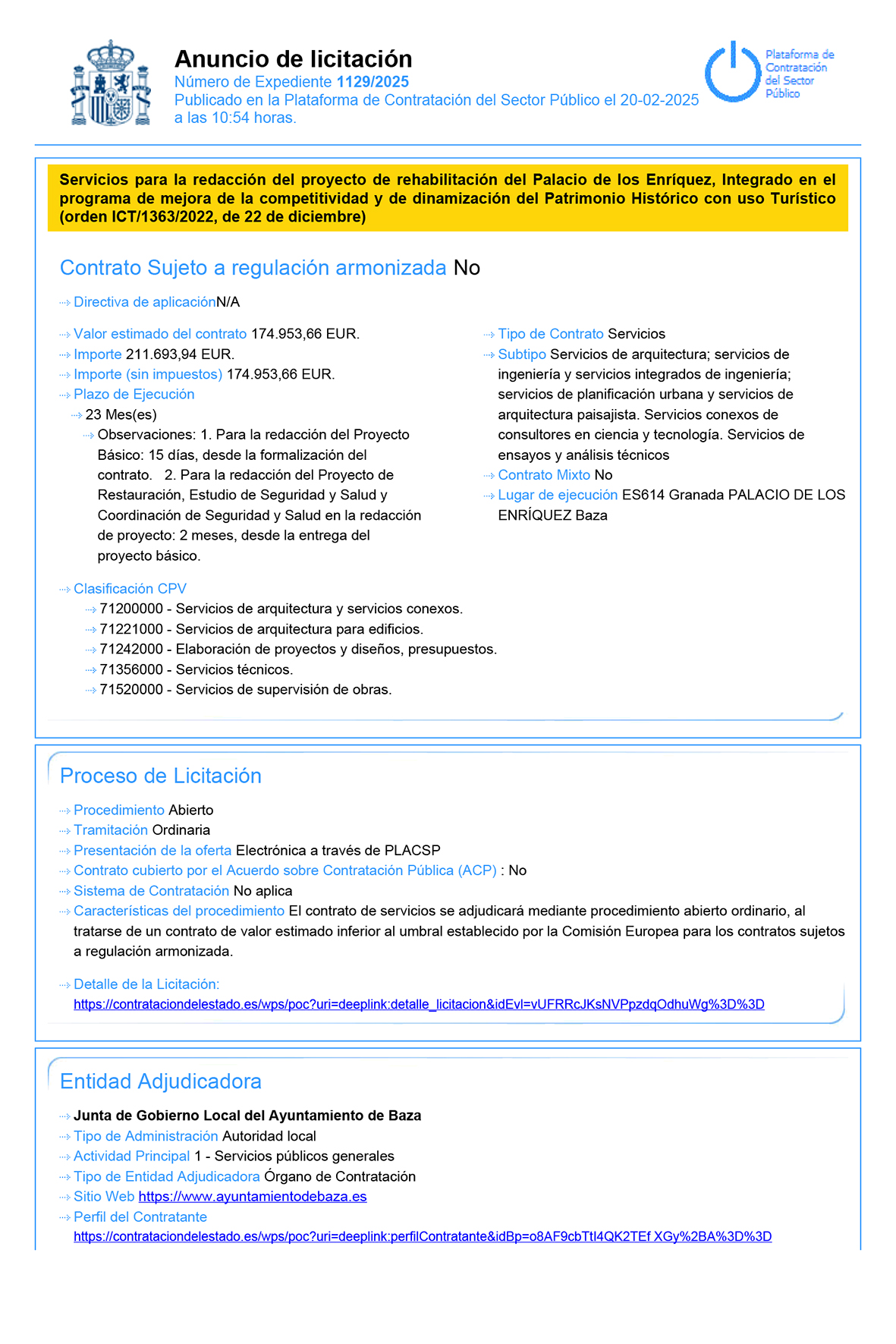 Sale a licitación la redacción del proyecto de rehabilitación del Palacio de los Enríquez. El Ayuntamiento de Baza ha dado un importante paso para la recuperación del Palacio de los Enríquez con la publicación, a través de la Plataforma de Contratación del Sector Público, del anuncio de licitación para la redacción del proyecto de rehabilitación de este emblemático edificio renacentista.