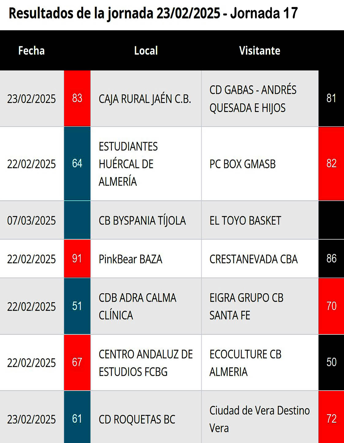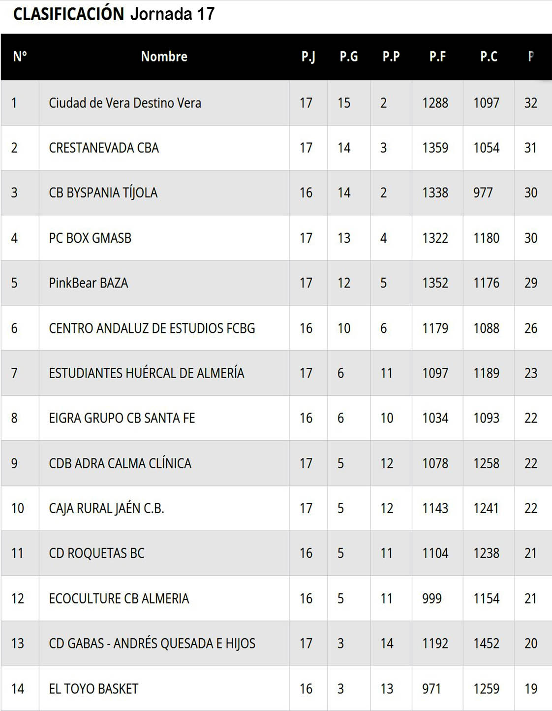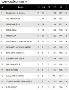 Resultados y clasificación tras la jornada 17 en el grupo C de la Primera Nacional de Baloncesto de Andalucía. (Clicar en las imágenes para ampliarlas):