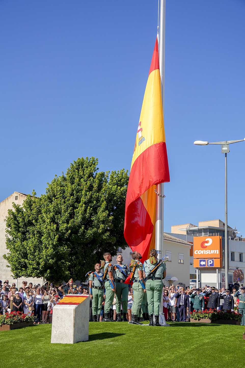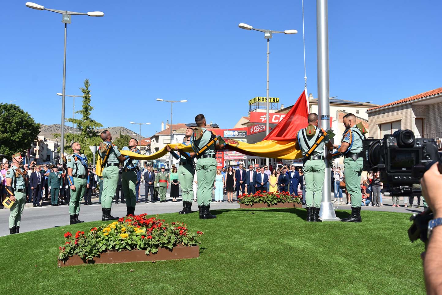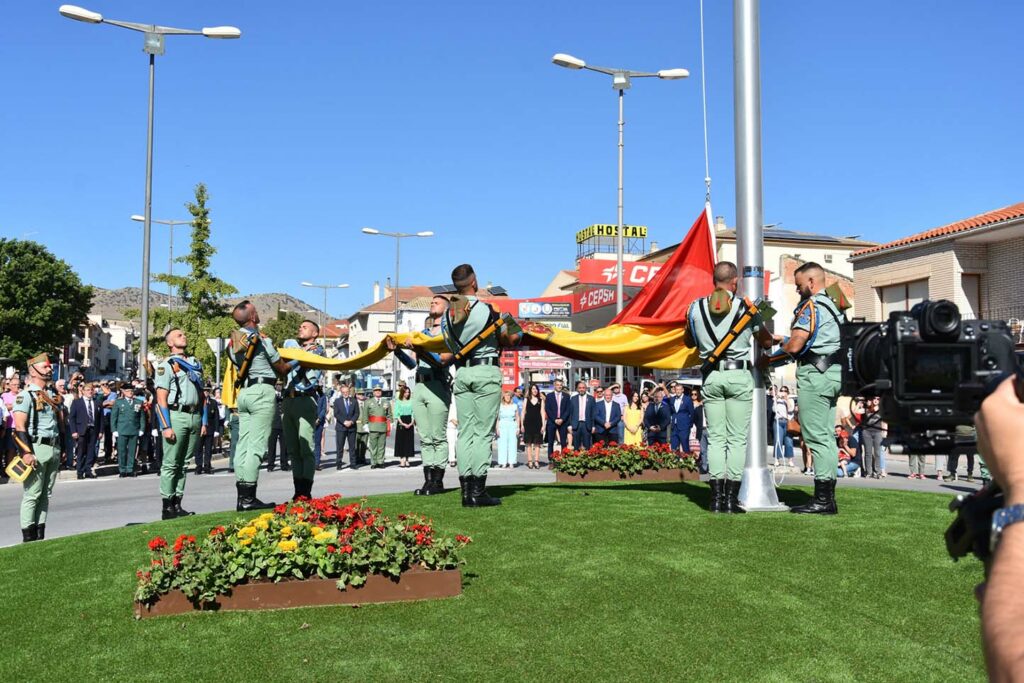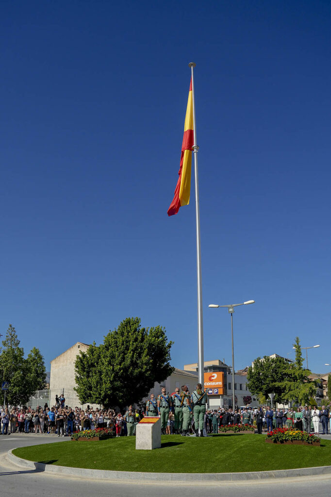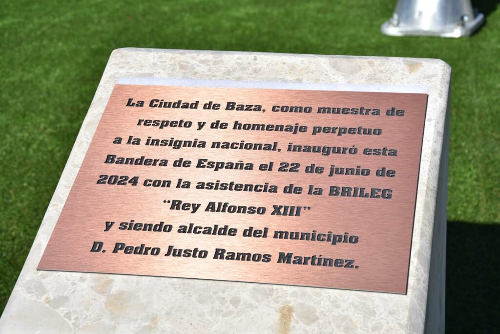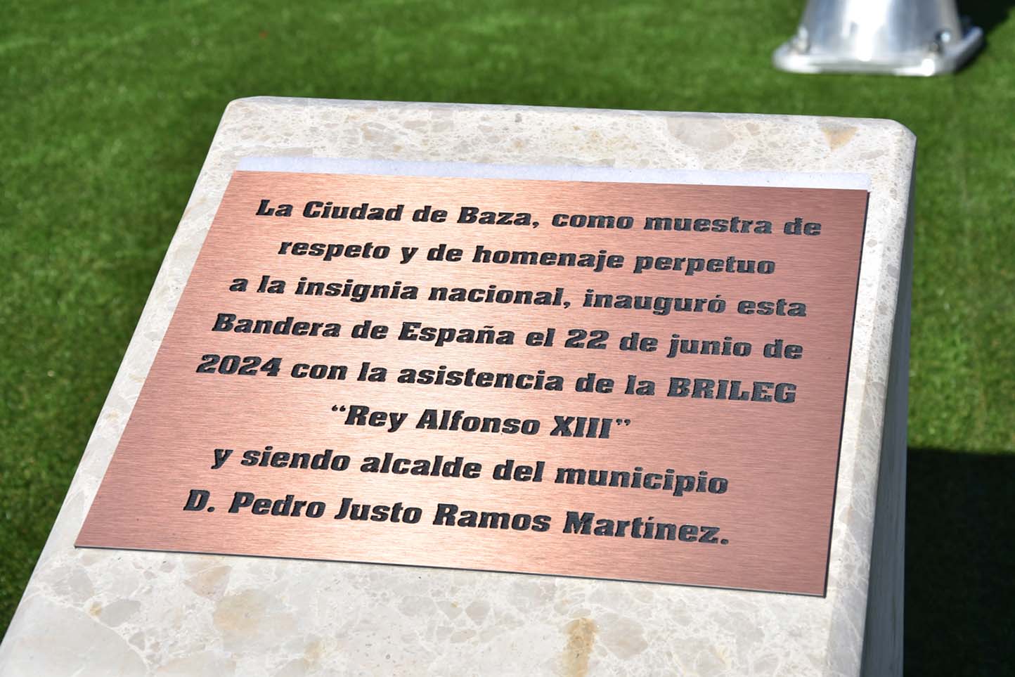 Se dio inicio al acto con los sones del himno nacional, mientras un grupo de caballeros legionarios portaba hasta el lugar la enseña y la izaban hasta el punto más alto, tras lo que se descubrió el texto que se encuentra en el monolito, donde dice “La Ciudad de Baza, como muestra del respeto y de homenaje perpetuo a la insignia nacional, inauguró esta Bandera de España el 22 de junio de 2024 con la asistencia de la BRILEG “Rey Alfonso XIII” y siendo alcalde del municipio D. Pedro Justo Ramos Martínez”.