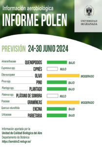 La UCBA-UGR da por finalizada la temporada de niveles polínicos significativamente altos en la atmósfera de Granada. La Unidad de Calidad Biológica del Aire CBA-UGR informa que, tras semanas de niveles extremos y altos de polen de olivo y gramíneas, las concentraciones se encuentran ya en valores moderados (inferiores a 100 granos/m3 en el caso del olivo y de 50 granos/m3 en el caso de gramíneas).
