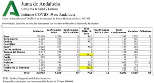 - El pasado jueves, en la comarca de Baza hubo un nuevo caso en Cúllar y 3 en el Hospital de Baza, mientras que en la comarca de Guadix se sumaron 1 en el HAR accitano, 1 en Purullena, 1 en Aldeire, 1 en Alquife, 2 en Guadix y 1 en Pedro Martínez.