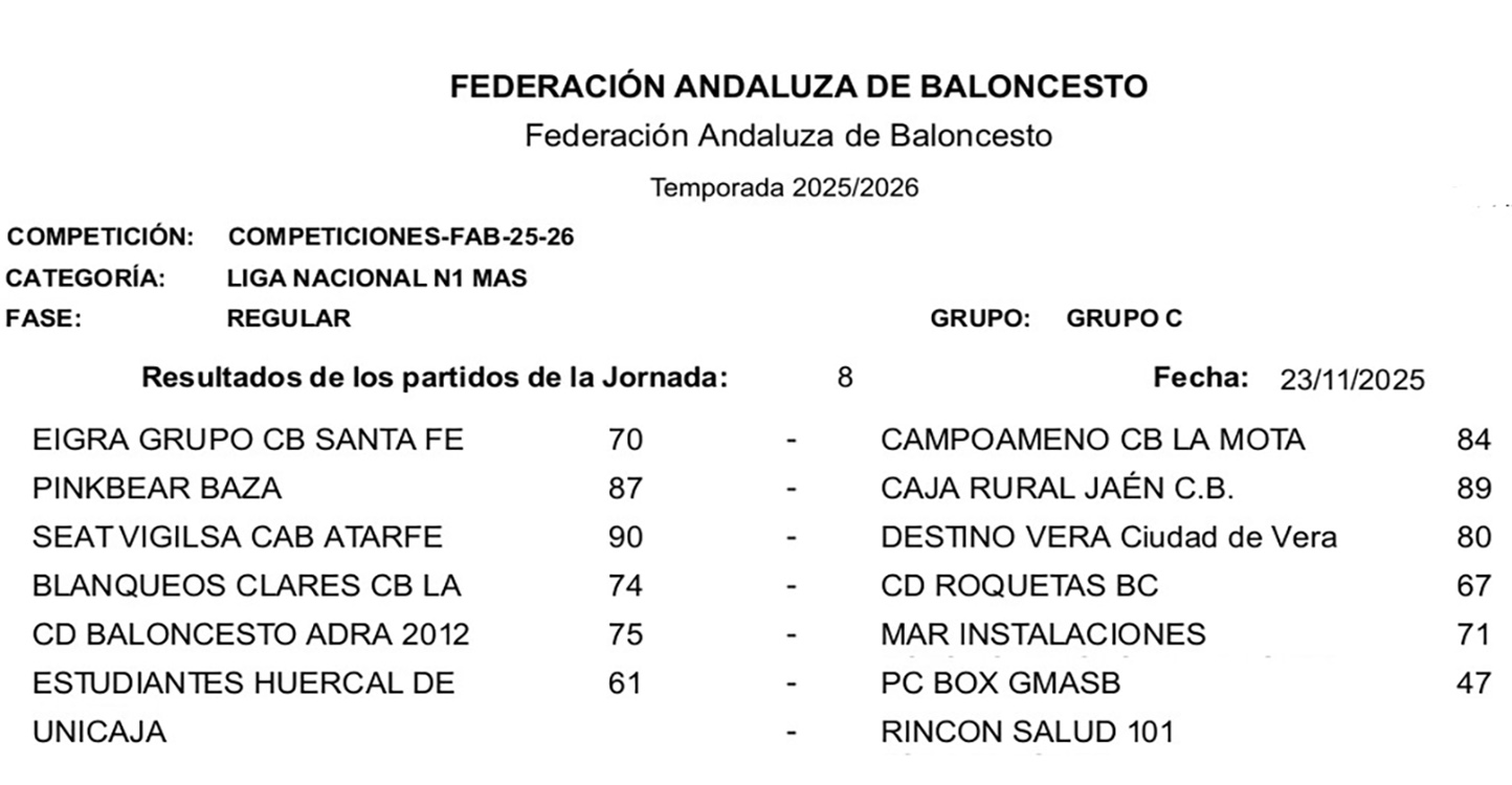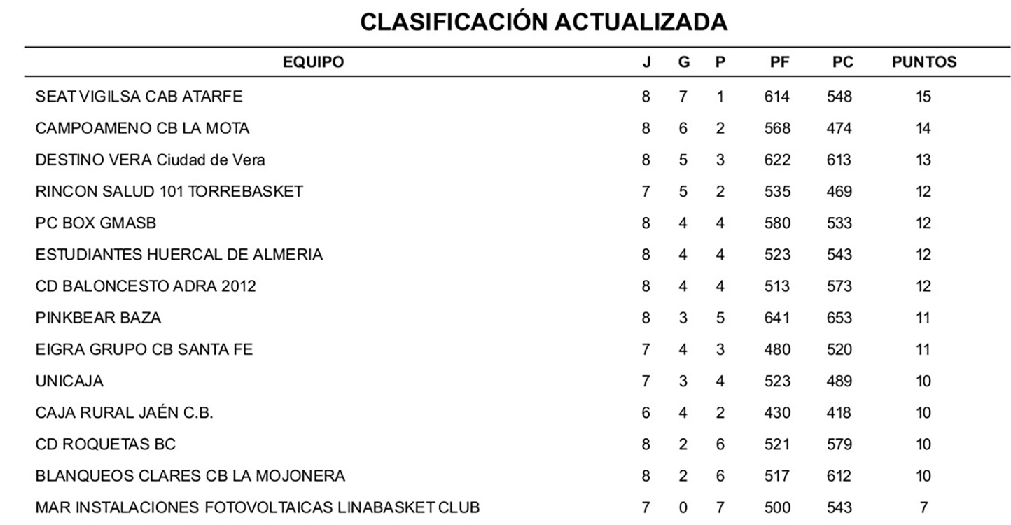 Resultados y clasificación tras la disputa de la jornada 5 en la Primera Nacional Andaluza de Baloncesto. (Clicar en las imágenes para agrandarlas):
