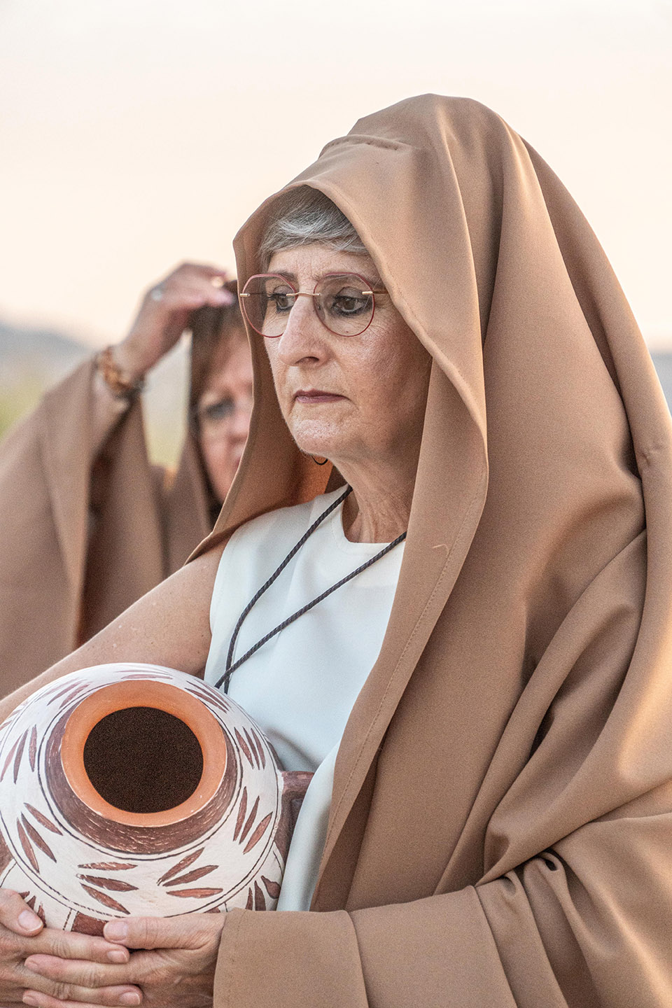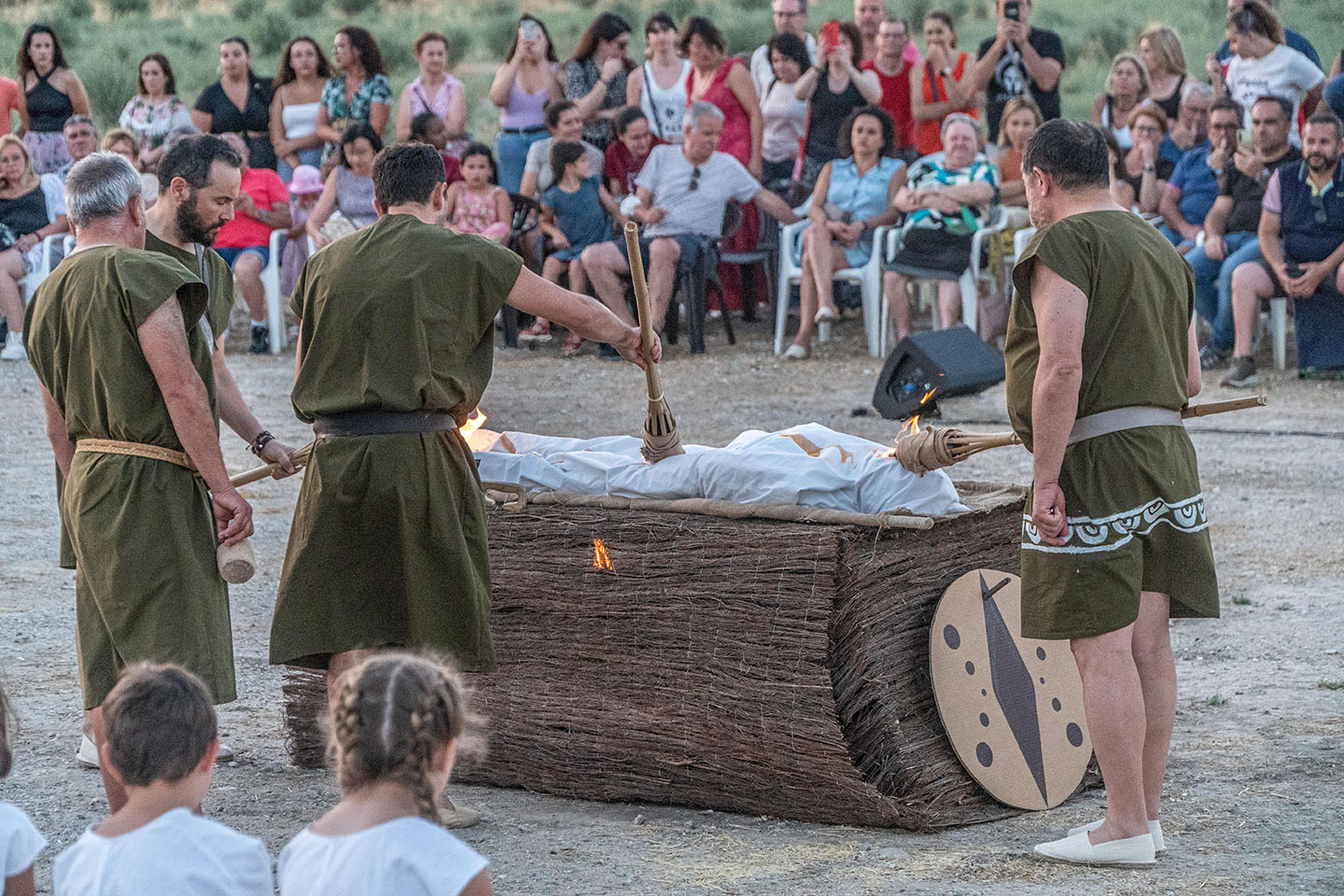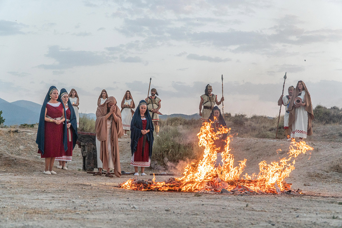 El ritual de cremación consiste en una recreación construida en torno a la idea de cómo debió ser, en su momento, la despedida de la Dama de Baza al producirse su fallecimiento e incineración, pues no olvidemos que la misma escultura tenía una oquedad en la que se guardaban las cenizas de este personaje.
