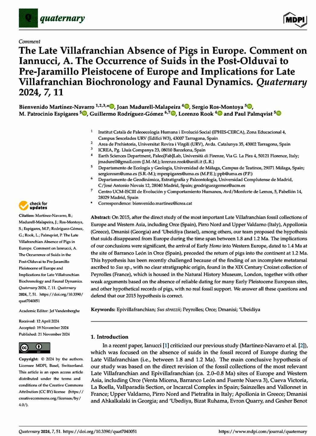 Unos autores que hacen una revisión crítica y rebaten, de manera convincente, un trabajo reciente en el que se discutía su hipótesis sobre la ausencia de cerdos fósiles en el Pleistoceno inferior de Europa, entre hace 1,8 y 1,2 millones de años de antigüedad, que publicaron hace una década.