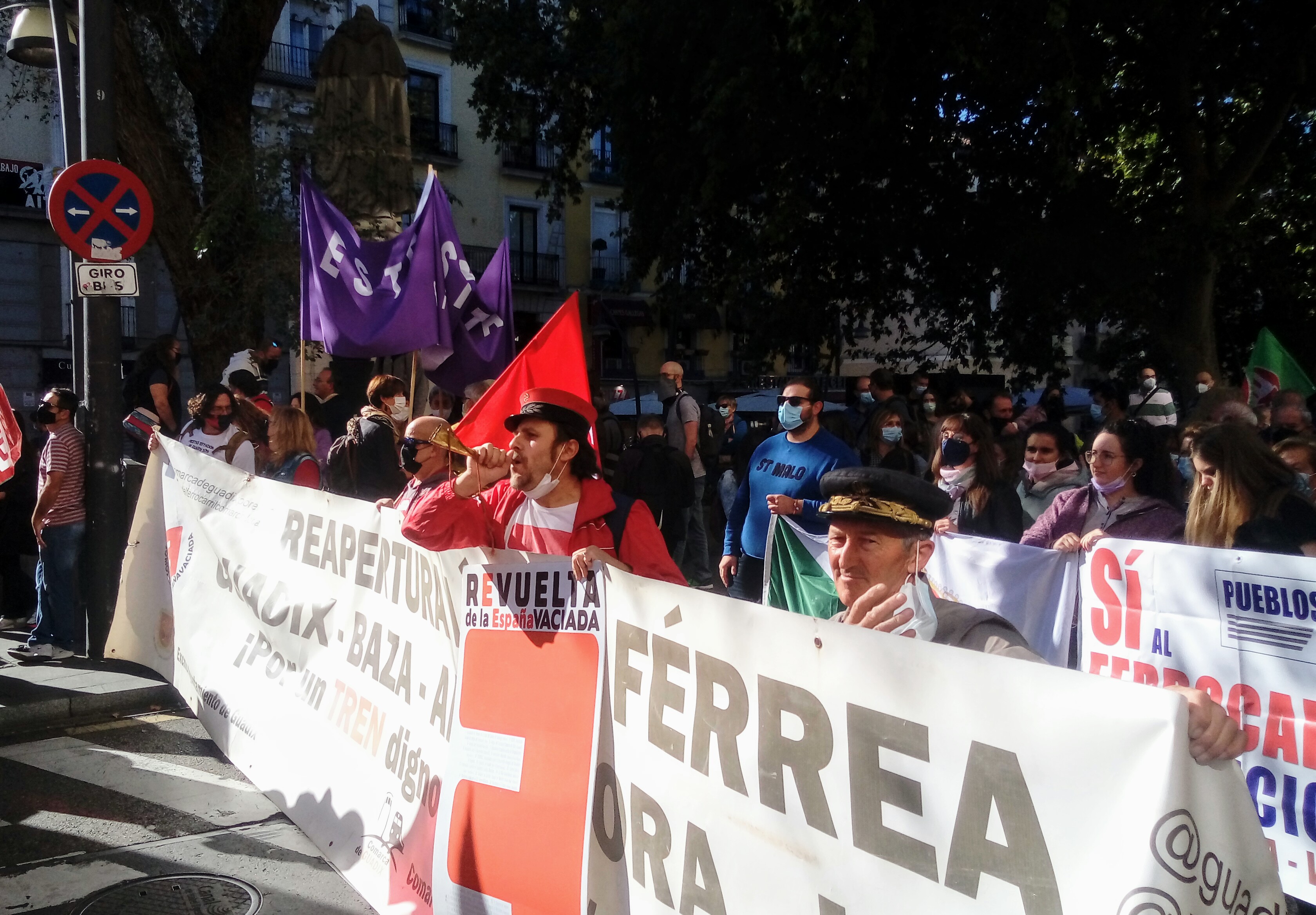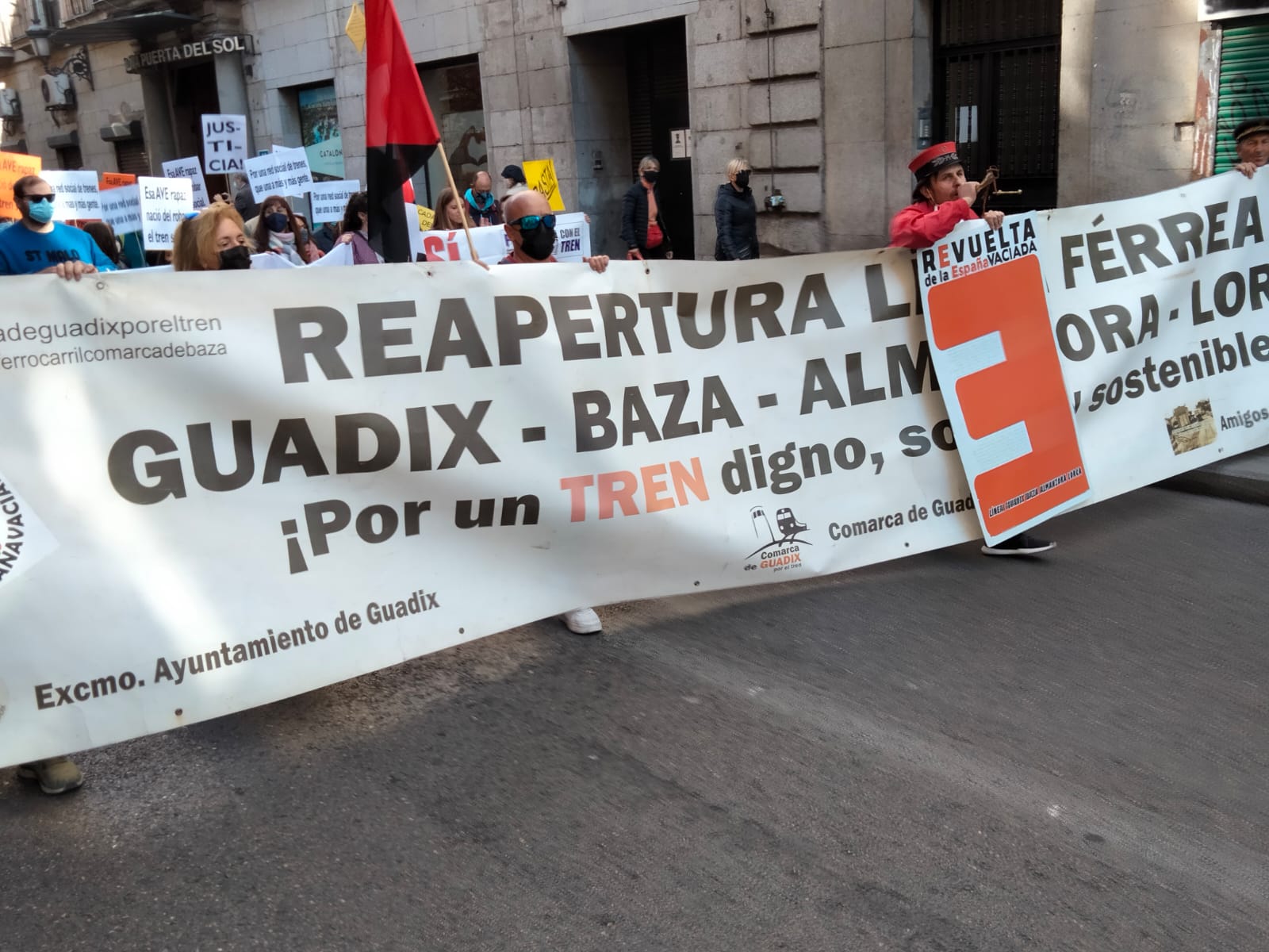 Los gritos reclamando la vuelta del tren Guadix Baza Almanzora Lorca y la inmediata adjudicación definitiva de su Estudio Informativo de reapertura han resonado con fuerza este fin de semana en las calles de Madrid y Granada. La Asociación Amigos del Ferrocarril Comarca de Baza y la Plataforma Comarca de Guadix por el Tren han participado activamente en las masivas manifestaciones a escala estatal por el tren normal y contra el cambio climático que, bajo el lema «Por un tren que vertebre los territorios y enfríe el planeta», ha unido en la reivindicación a numerosos colectivos ferroviarios, sociales, ecologistas, estudiantiles y de la España Vaciada.