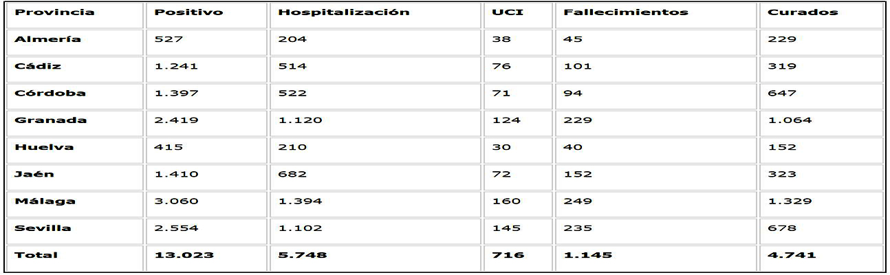Por provincias: en Almería (34 hospitalizaciones de los que 12 en UCI), Cádiz (108 hospitalizaciones de los que 24 en UCI), Córdoba (57 hospitalizaciones de los que 21 en UCI), Granada (191 hospitalizaciones de los que 38 en UCI), Huelva (25 hospitalizaciones de los que 9 en UCI), Jaén (80 hospitalizaciones de los que 19 en UCI), Málaga (146 hospitalizaciones de los que 34 en UCI) y Sevilla (155 hospitalizaciones de los que 38 en UCI).
